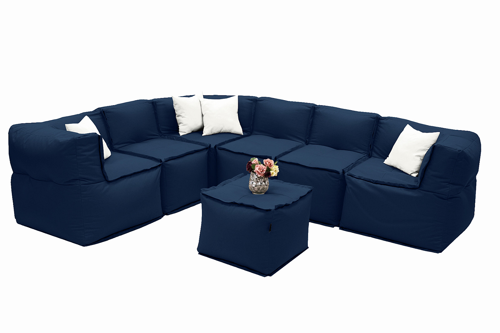 Sestava obsahuje: 3x Záhradný textilný rohový diel MODULTEX (tmavo modrá), 3x Záhradný textilný stredový diel MODULTEX (tmavo modrá), 1x Záhradný textilný stolík/taburet MODULTEX (tmavo modrá)