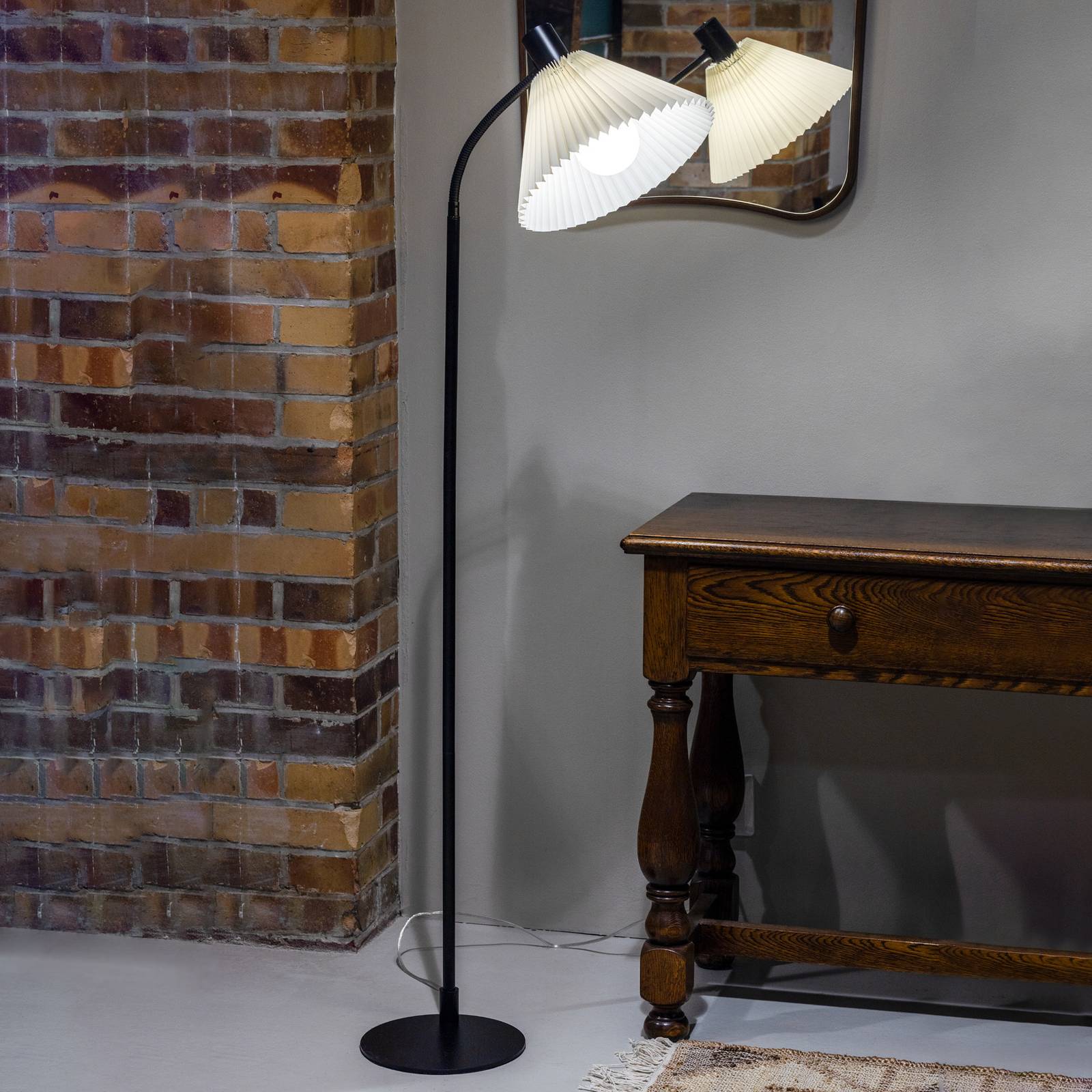 Stojacia lampa Mira so skladaným látkovým tienidlom v sivobielej farbe Stojacia lampa Mira bola vytvorená v estetickom dizajne, ktorý sa hodí ku klasickým aj moderným štýlom zariadenia. Na jednoduchý kovový rám je pripevnené elegantné, mierne smerom nahor zahnuté textilné tienidlo z off-white tkaniny, ktoré vytvára útulnú svetelnú atmosféru. Vybavené vypínačom na kábli – Textilný kábel v čiernej farbe