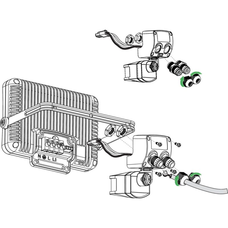 Modul detektora pohybu pre theLeda B. Tento senzorový modul je možné kombinovať s modelmi série Leda B. Senzor je možné otáčať a natáčať – horizontálne o 90 ° a dozadu alebo dole tiež o 90 °. – Odporúčaná montážna výška: 2,5 m – Uhol detekcie: 180 ° – Dosah: 12 m – Nastavenie času: 5 s až 15 min – Jas pri zapnutí: 2 až 1 000 luxov – ďalšie spínacie výstupné svetlo – schopný pán-otrok – Max. Spínacia záťaž: 140 W LED – Teplota okolia: – 20 ° C až + 40 ° C