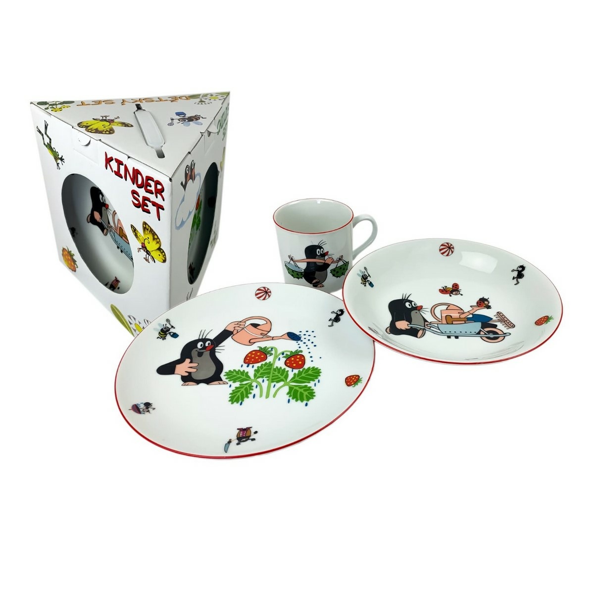 3-dielna porcelánová sada s veselým motívom Krtka poteší všetky deti. Obsahuje plytký tanier, hlboký tanier miskového typu a hrnček. Všetko v komfortnej veľkosti akurát na detské stolovanie.Sada je vyrobená z kvalitného Českého porcelánu. Zabalená v krásnom darčekovom balení.Vďaka použitému materiálu je údržba jednoduchá, riad je možné umývať v umývačke riadu a používať v mikrovlnke.Obsah sady:1x plytký tanier – pr. 21 cm1x hlboký tanier – pr. 20 cm1x hrnček – objem 220 ml