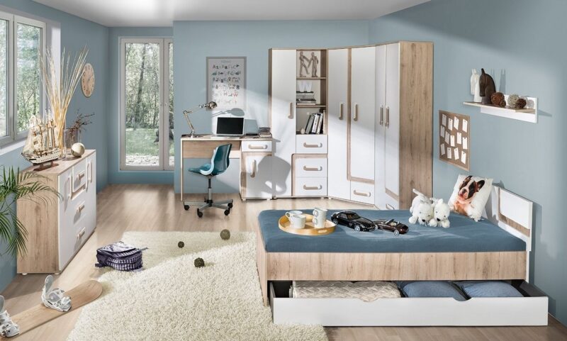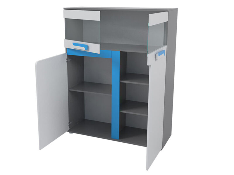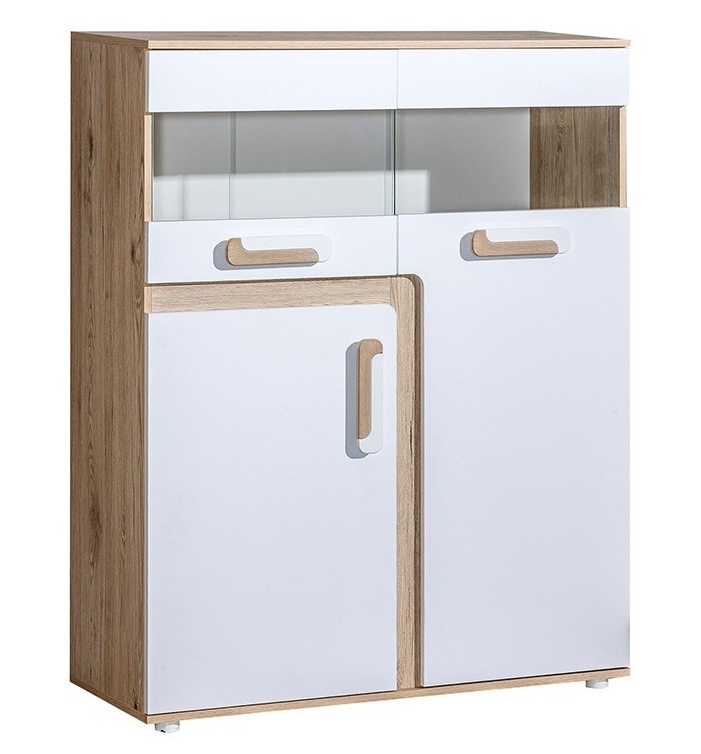 Skrinka TITO 16 patrí do zaujímavej rady nábytku TITO, ktorá sa vyznačuje nápaditým dizajnom s výraznými úchytkami. Stolík je vyrobený z kvalitnej LTD dosky. Korpus nábytku je vyrobený vo farebnom prevedení dub svetlý. Dvierka a úchyty sú v kombinácii farieb biela matná/dub svetlý.Skrinka je členená na 2 časti. Horná – vitrínová časť má presklené dvierka. Spodná časť skrinky má plné dvierka. V ľavej časti sa nachádza 1 polička a v pravej časti 2 poličky na odkladanie napr. oblečenia.Rozmery (v/š/h): 136 x 110 x 40 cm. Dodávame v demonte.Sektorový nábytok TITO vám ponúka na výber mnoho samostatných skriniek, z ktorých si môžete vyskladať jedinečnú detskú, či študentskú izbu.