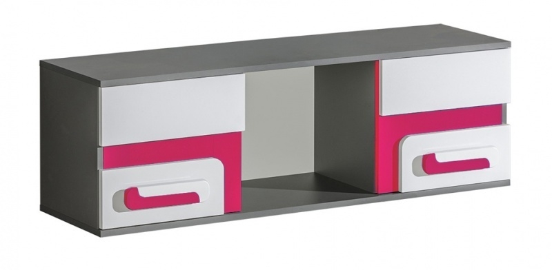 Závesný regál TITO A10 patrí do zaujímavej rady nábytku TITO, ktorá sa vyznačuje nápaditým dizajnom s výraznými úchytkami. Skrinka je vyrobená z kvalitnej LTD dosky. Korpus nábytku je vo farebnom prevedení antracit. Dvierka a úchyty sú v kombinácii biela matná/ ružová.Rozmery (v/š/h): 38 x 120 x 32 cm. Dodávame v demonte.Sektorový nábytok TITO vám ponúka na výber mnoho samostatných skriniek, z ktorých si môžete vyskladať jedinečnú detskú, či študentskú izbu.