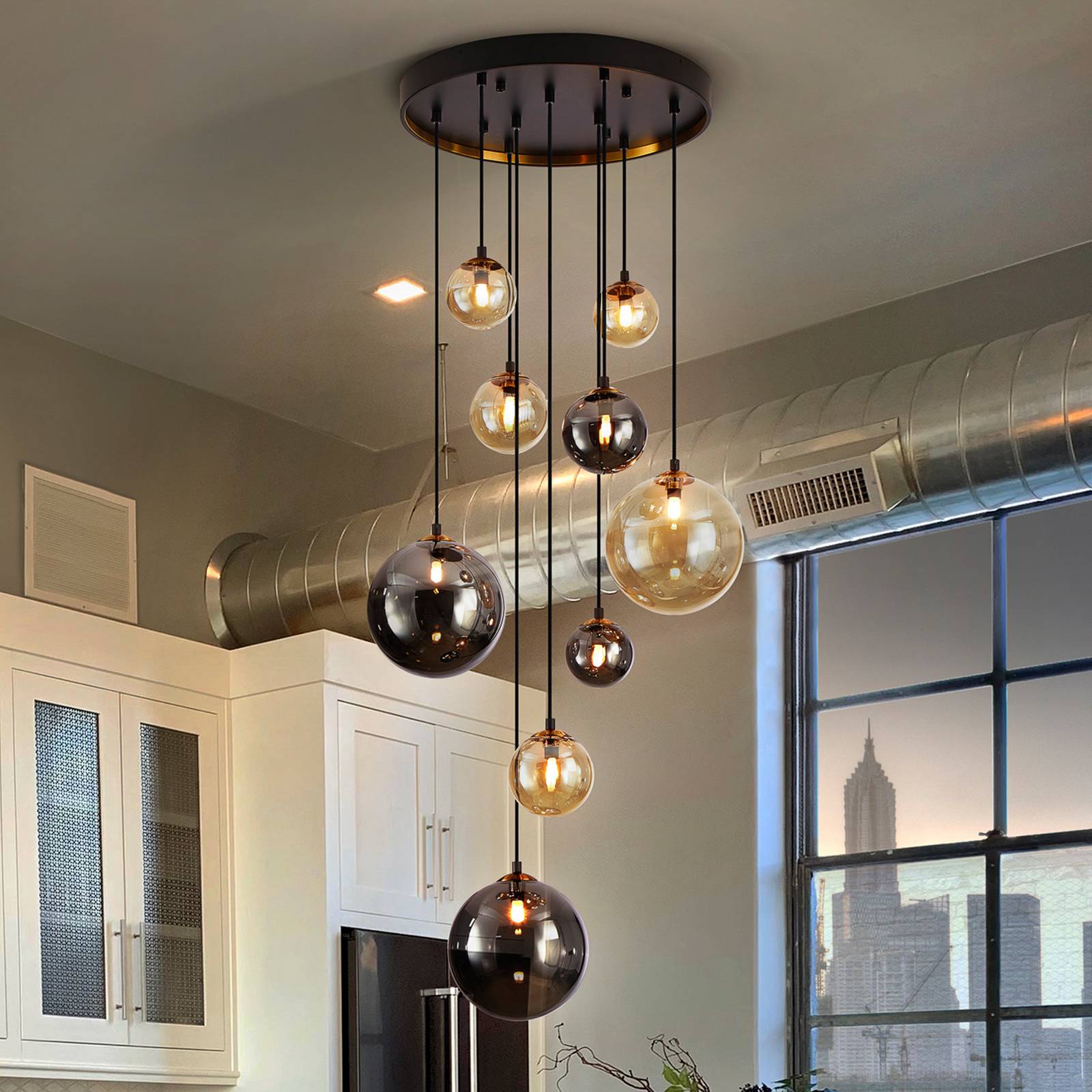 Tmavé závesné svietidlo s guľovými odtieňmi rôznych veľkostí a farieb Závesné svietidlo Dark upúta pozornosť v každom obytnom priestore. Početné guľovité tienidlá rôznych veľkostí a farieb visia v rôznych výškach z okrúhleho železného vrchlíka s čiernou povrchovou úpravou. Čiastočne jantárovo sfarbené a čiastočne tónované do dymovo sivej farby vytvárajú nádherný svetelný efekt. Závesné svietidlo sa dodáva s modernými a energeticky úspornými LED žiarovkami G9 a vďaka dlhému zaveseniu až do 300 cm je ideálne aj do vysokých miestností – dodávka vrátane montážneho materiálu