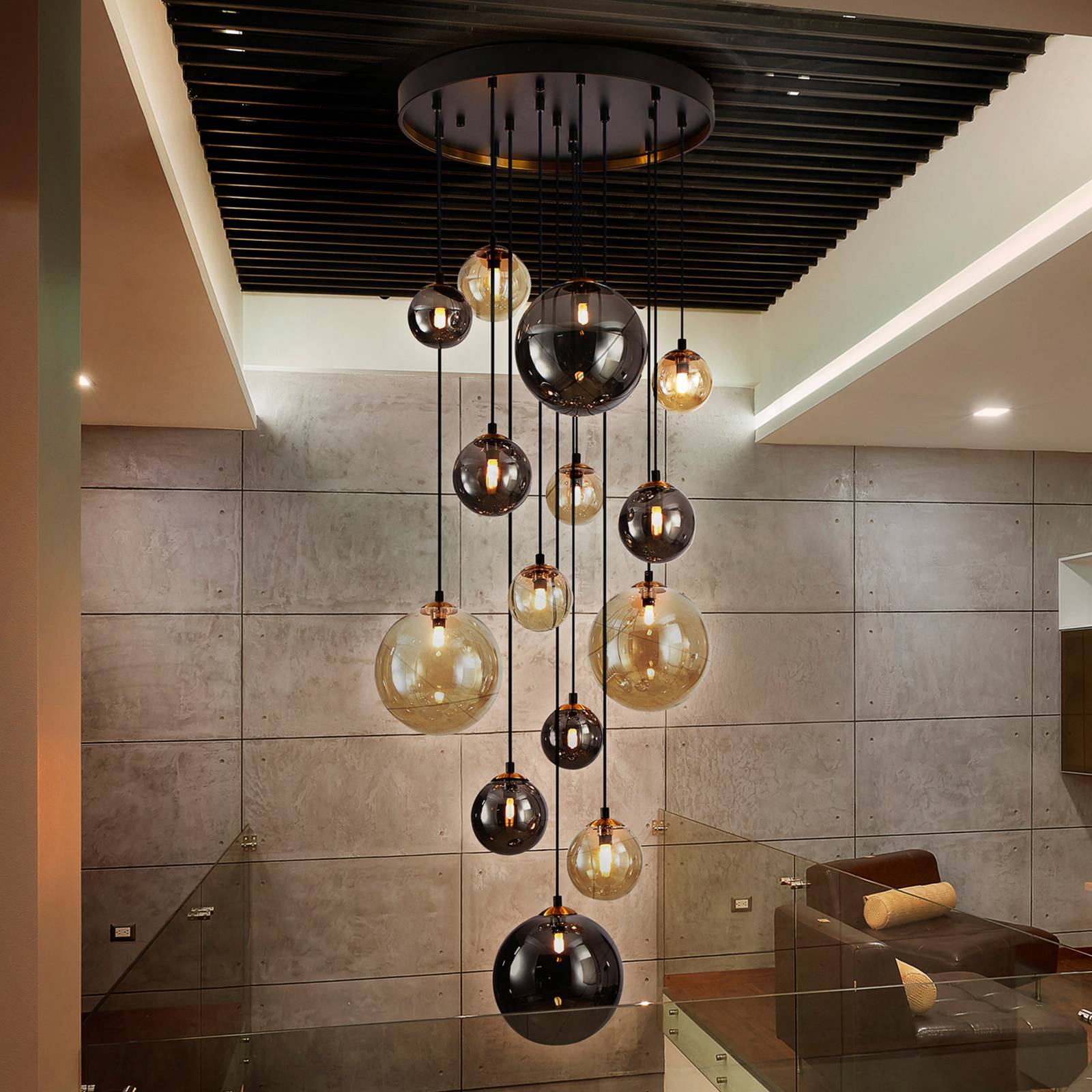 Tmavé závesné svietidlo s guľovými odtieňmi rôznych veľkostí a farieb Závesné svietidlo Dark upúta pozornosť v každom obytnom priestore. Početné guľovité tienidlá rôznych veľkostí a farieb visia v rôznych výškach z okrúhleho železného vrchlíka s čiernou povrchovou úpravou. Čiastočne jantárovo sfarbené a čiastočne tónované do dymovo sivej farby vytvárajú nádherný svetelný efekt. Závesné svietidlo sa dodáva s modernými a energeticky úspornými LED žiarovkami G9 a vďaka dlhému zaveseniu až do 300 cm je ideálne aj do vysokých miestností – dodávka vrátane montážneho materiálu