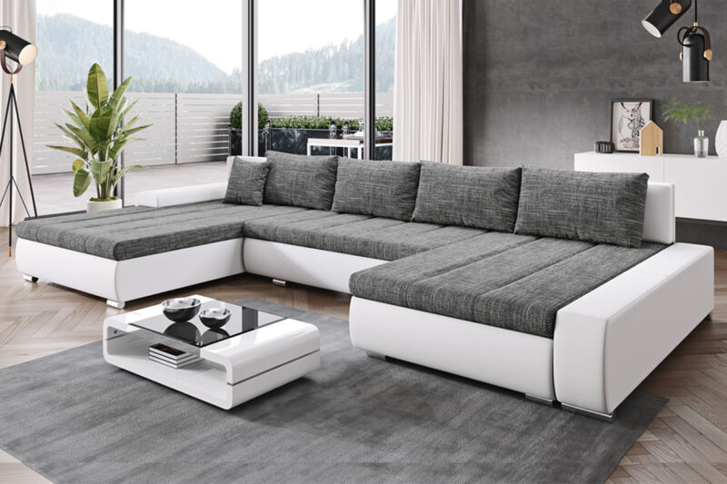 Ak hľadáte výnimočnú sedačku na zariadenie štýlovej obývačky, určite Vás zaujme účková sedačka TOBIAS. Je navrhnutá v módnych trendových líniách a poskytne veľkú plochu na oddych či leňošenie. Aj vo veľkom priestore vynikne a stane sa dominantným prvkom celého interiéru. Sedačka ponúka módny trend nízkch opierok chrbta s vankúšmi. Lesklé nožičky a kombinácia materiálu zvýrazňuje jej celkový vzhľad.Sedacia časť je vyrobená v kombinácii vlnovcovej pružiny a PUR peny typu T30. Je čalúnená kombináciou eko-kože Madryt (spodná časť) a látky Berlin. Nohy sedačky sú kovové-pochrómované, ich výška je 5 cm.Sedačka ponúka možnosť rozkladu, ktorý využíva mechanizmus DELFIN. Vďaka nemu si jednoduchým spôsobom rýchlo vytvoríte spaciu plochu 147 x 376 cm, vhodnú na príležitostné spanie. Súčasťou je aj praktický úložný priestor, ktorý oceníte v každej domácnosti.Farebné prevedenie: Berlin 01/Madryt 120 v kombinácii farieb sivá/biela. Prevedenie rohu je ľavé. Ponúkame aj sedačku TOBIAS v pravom prevedení rohu.Rozmery (š/v/h): 400 x 85 x 180/210 cm. Hĺbka sedu 62 cm, výška sedu 42 cm, výška bez podušiek 80 cm.V našej ponuke nájdete viacero farebných prevedení tejto dominantnej a modernej sedačky.