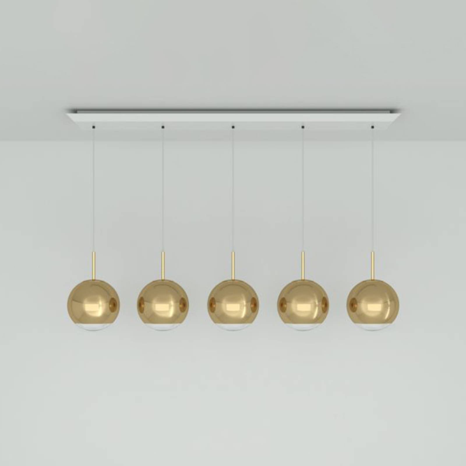 Závesné svietidlo LED Mirror Ball 25 cm Linear s piatimi žiarovkami a guľovými tienidlami v kovovom vzhľade So závesným svietidlom LED Mirror Ball 25 cm Linear možno efektívne osvetliť dlhý stôl alebo kuchynskú linku. Výsledkom je skutočný glamour vzhľad, pretože polykarbonátové tienidlá, každé s priemerom 25 cm, sú približne z troch štvrtín pokryté vysokolesklým metalickým povrchom, ktorý pôsobivo odráža dopadajúce svetlo. Svietidlo tak svieti aj pri vypnutom svetle. Spodná tretina je priehľadná, takže svetlo integrovaných LED diód vyžaruje priamo nadol a do všetkých strán. Plná krása tohto jednoduchého, ale extravagantného svietidla sa však prejaví až po zapnutí osvetlenia. Výsledkom je očarujúci svetelný efekt s teplým a útulným svetlom. – stmievateľné (externé)