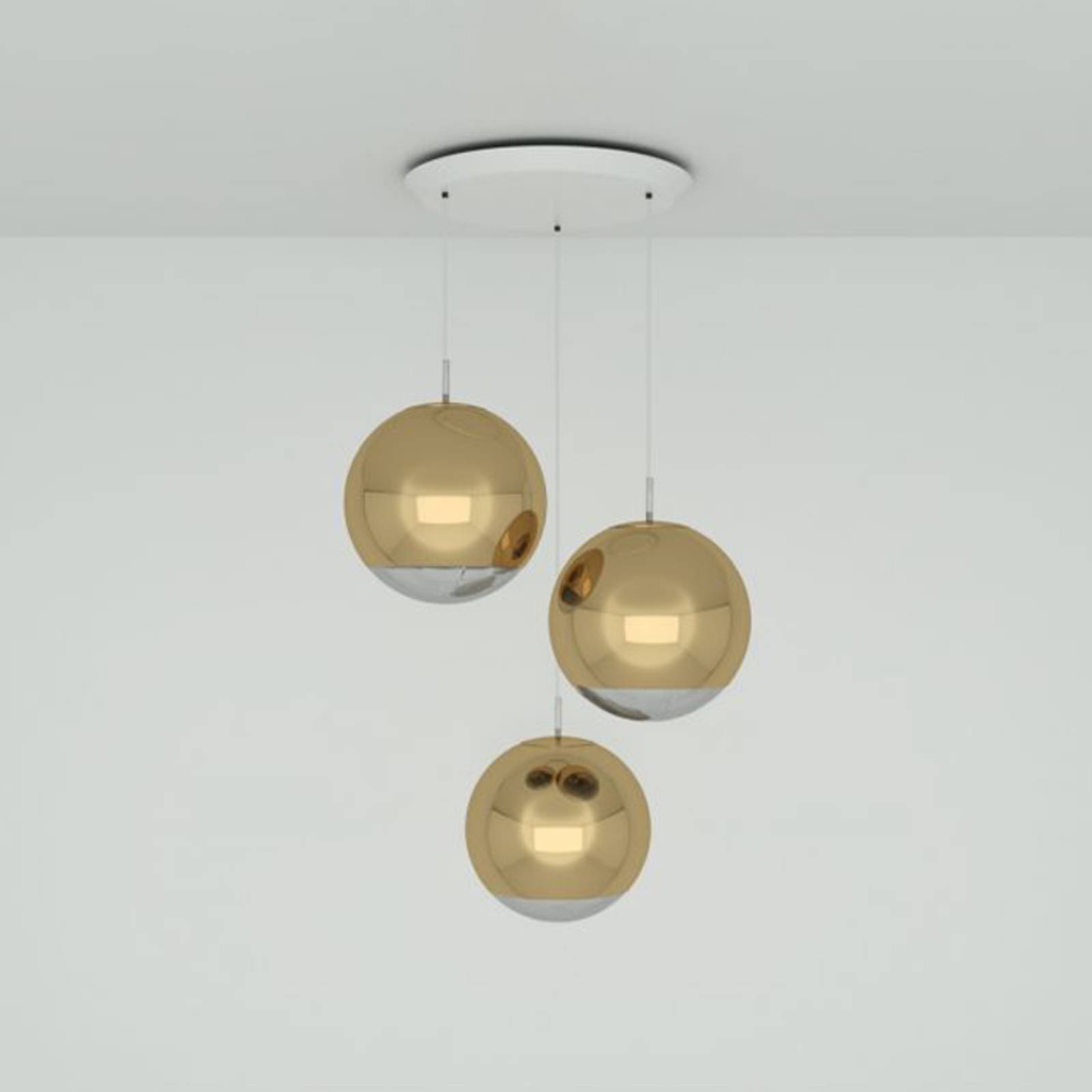 Brilantne spracovaná závesná LED lampa Mirror Ball 40 cm Round – trojplameňová Trojplameňová závesná LED lampa Mirror Ball 40 cm Round je čistou pastvou pre oči: Skladá sa z troch samostatných svietidiel s priehľadnými káblami a guľovitými polykarbonátovými tienidlami, ktoré sú úplne priehľadné len v spodnej časti, a tak priamo vyžarujú svetlo zabudovaných LED diód. Približne tri štvrtiny tienidla sú pokryté reflexným metalickým lakom, takže svetlo dopadajúce na povrch zvonku, napríklad slnečné lúče prenikajúce cez okno, vytvára fantastické odlesky, vďaka čomu je trojlampový závesný lampáš dekoratívnym lákadlom aj po vypnutí. Priehľadné káble vytvárajú dojem, že sa guľovité tienidlá vznášajú v miestnosti. – stmievateľné