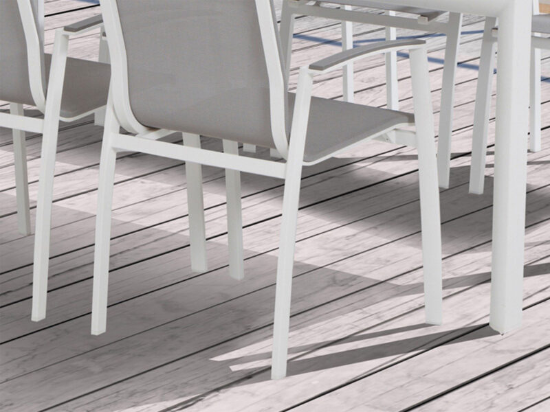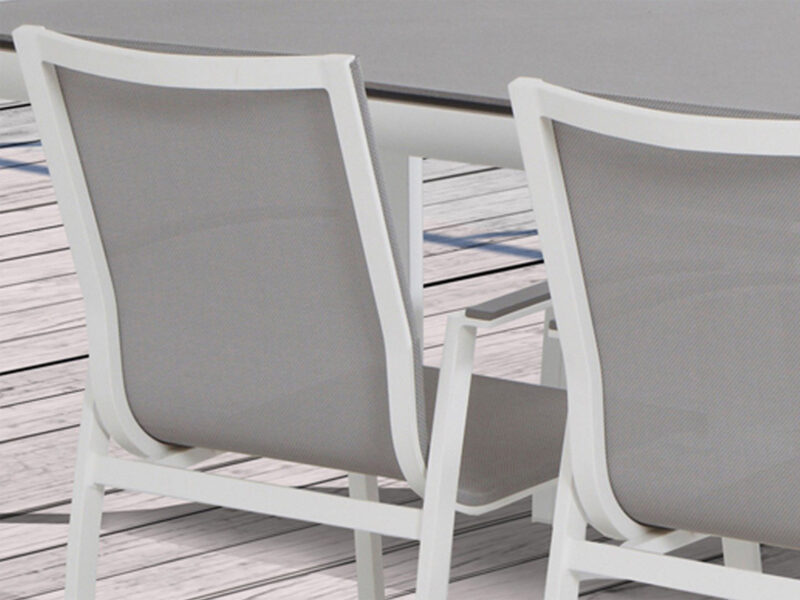 Moderná jedálenská stolička Torino v bielej farbe s hliníkovým rámom a výpletom z textilénu. Pohodlná, ľahká, stohovateľná a vhodná do každého exteriéru.