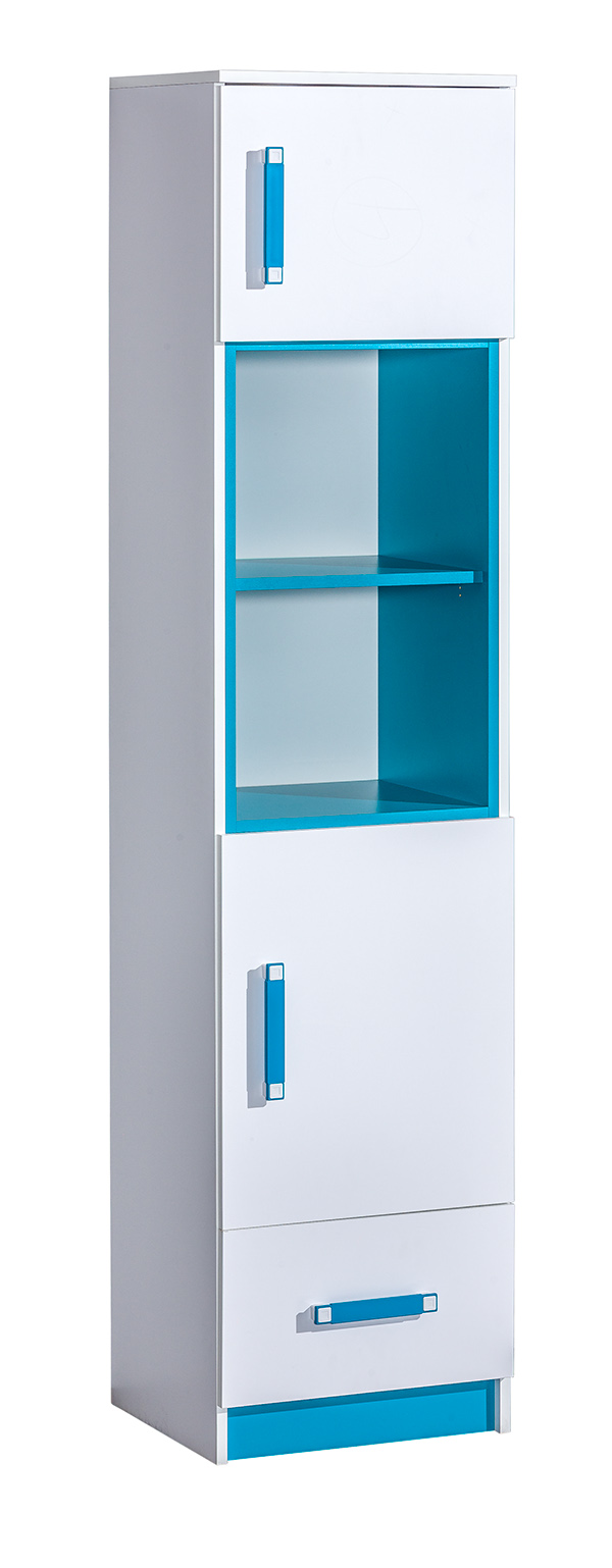 Vysoký regál TRAFIC je moderným a dizajnovým kúskom zo sektoru TRAFIC. Aj vďaka nemu si poskladáte študentskú izbu pre vaše deti podľa predstáv.Regál je dvojdverový. Vo vnútri sa nachádzajú police. Regál tiež disponuje praktickou zásuvkou a dvomi otvorenými policami. Farebné prevedenie je v kontraste biela, tyrkysová. Pri výrobe boli použité kvalitné LTD dosky.Detská izba Trafic vás zaujme nielen svojím vzhľadom ale aj funkčnosťou. Je zložená z viacerých zaujímavých komponentov. Detská izba bola navrhnutá tak, že každý komponent z detskej izby má dostatok úložného priestoru na uloženie vašich vecí. Isto poteší vašich teenagerov svojim dizajnom a prevedením.Dodávame v demontovanom stave.
