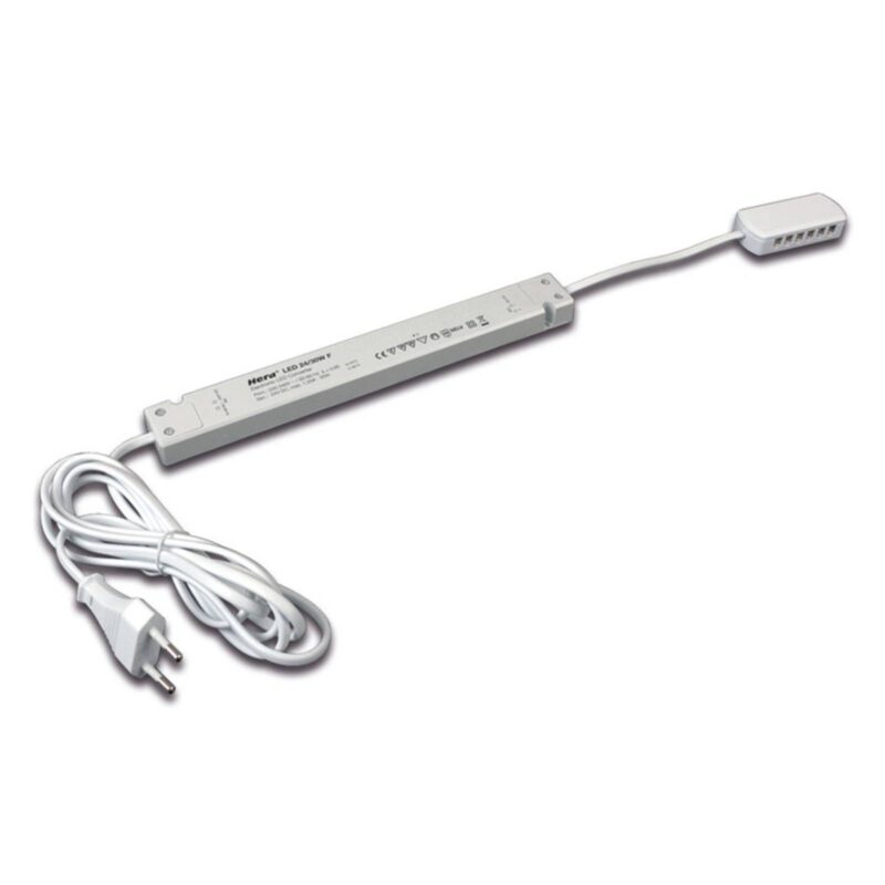 Transformátor 230V na 24V DC s 12-cestným rozdeľovačom pre Hera LED 24, max. 30 W Tento transformátor je vhodný na napájanie zariadení so vstupným napätím 24 V, ktoré sú vybavené zástrčkami Hera LED 24. Transformátor, ktorý má plochý dizajn, má zástrčku na pripojenie do zásuvky. – Trieda ochrany: IP20 – Celkový výkon dodávaných zariadení: max. 30 W – Prípustná dĺžka sekundárnych vedení: max. 5 m – Bezpečnosť v prípade skratu, preťaženia a prevádzky naprázdno