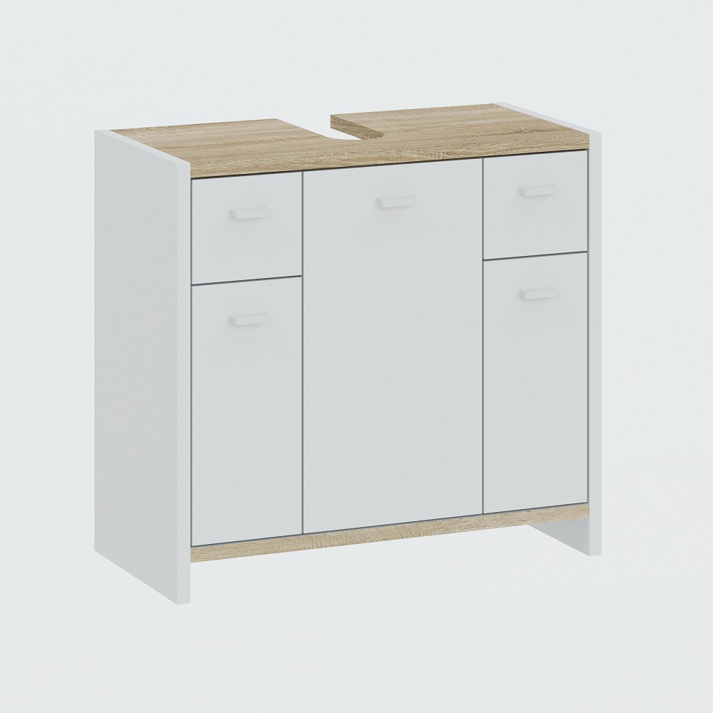 Kúpeľňová skrinka TREO ponúka moderný dizajn v bielom matnom prevedení v kombinácií s farbou duba. Ponúka bohatý úložný priestor vďaka dvom zásuvkám a trom priehradkám.S výrezom na sifón sa hodí k všetkým bežným umývadlám. Drevotriesková doska LTD odolná proti poškriabaniu je typická ľahkou údržbou a vďaka vrstve z melamínovej živice je odolná a vhodná do vlhkého prostredia. Rozmery: (Š x V x H) 60 × 55 × 28 cmHmotnosť cca 15,1 kgDodávané v demonte.
