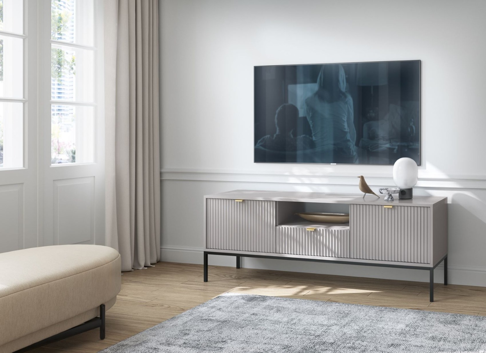 Dizajnový sektor NEW dodá Vašej obývacej miestnosti štýl. Pri sektore NEW sú použité najnovšie trendy v dizajne nábytku a kvalitný materiál. Korpus je vyrobený z 16mm LTD odolnej voči poškriabaniu, na dvierkach je použitá 18mm MDF riflovaná doska a úchyty sú hliníkové v zlatom farebnom prevedení. Všetky hrany sektoru NEW sú chránené ABS páskou.Tv stolík RTV154 má po stranách dvierka, kde si môžete uložiť všetky potrebné veci, v strede je odkladacia polica vhodná napr. na set-top box a pod ňou sa nachádza ešte zásuvka. Materiál: 16mm LTD, ABS hrany, hliníkové zlaté úchyty, 18mm MDF riflovaná doska na dvierkachRozmer (ŠxVxH) : 154 x 56 x 39 cmVýška nožičiek: 20 cm Farebné prevedenie : sivýDodávame v demonte.