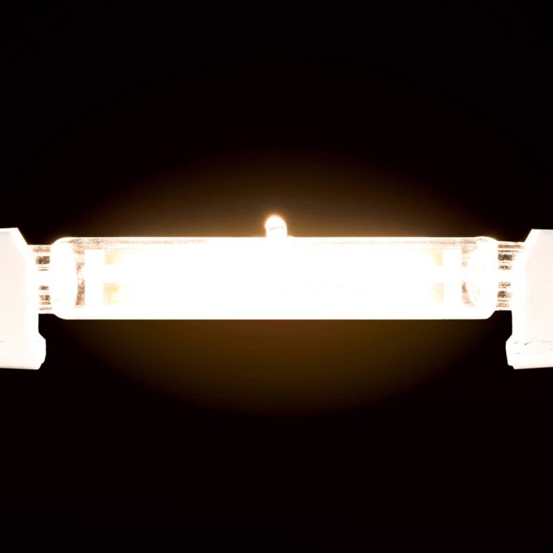 LED tyčová žiarovka R7s 118 mm 10 W s teplou bielou farbou svetla (3 000 K) a čírym povrchom – nie je stmievateľná – energeticky úsporná náhrada za bežné halogénové tyčové žiarovky