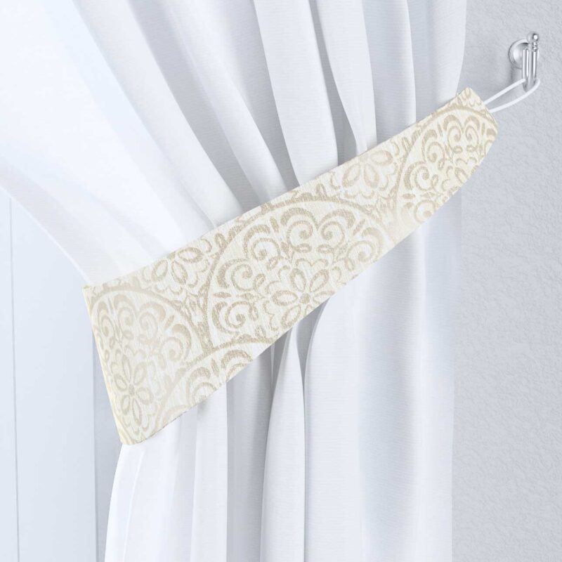 Úchyty Victoria slúžia na upnutie závesov. Sú štýlovým a elegantným doplnkom Vašich okenných dekorácií.Ak počas dňa potrebujete vpustiť do izby viac svetla, pomôžu Vám práve dekoračné, textilné úchyty k závesom.Rozmer: šírka 12cm x dĺžka 70cm.