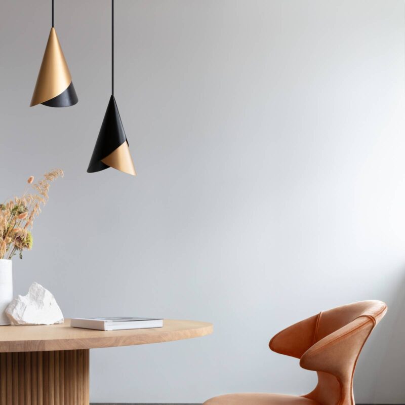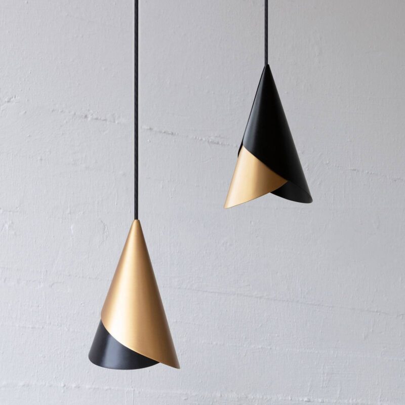 Kornetové príveskové svietidlo zúženého tvaru, čierne / mosadzné Dva jednotlivé tiene nad sebou tvoria tienidlo na lampu závesnej lampy Cornet, ktorý, ako už názov napovedá, vyvoláva myšlienky na kornútok zmrzliny, ktorého tvar je rovnaký ako tienidlo na lampu . Dva z týchto dáždnikov, jeden v čiernom a jeden v laku mosadznej farby, boli umiestnené jeden na druhom. Ich usporiadanie je však možné aj obrátiť alebo úplne demontovať, aby bolo možné kedykoľvek zmeniť vzhľad dáždnika. Malá závesná lampa je ideálna ako solitér na osvetlenie menšej plochy, ale môže byť tiež usporiadaná do dvoch alebo troch skupín do skupiny na osvetlenie veľkého stola. Závesné svietidlo pochádza od spoločnosti UMAGE od VITA Copenhagen, dizajnérskej UMAGE sa dizajnom osvetlenia, ktorá si dala za úlohu spojiť estetiku, jednoduchosť a funkčnosť s premysleným remeselným spracovaním. Výsledkom práce na UMAGE sú vynikajúce dizajny s trvalou výhodou.