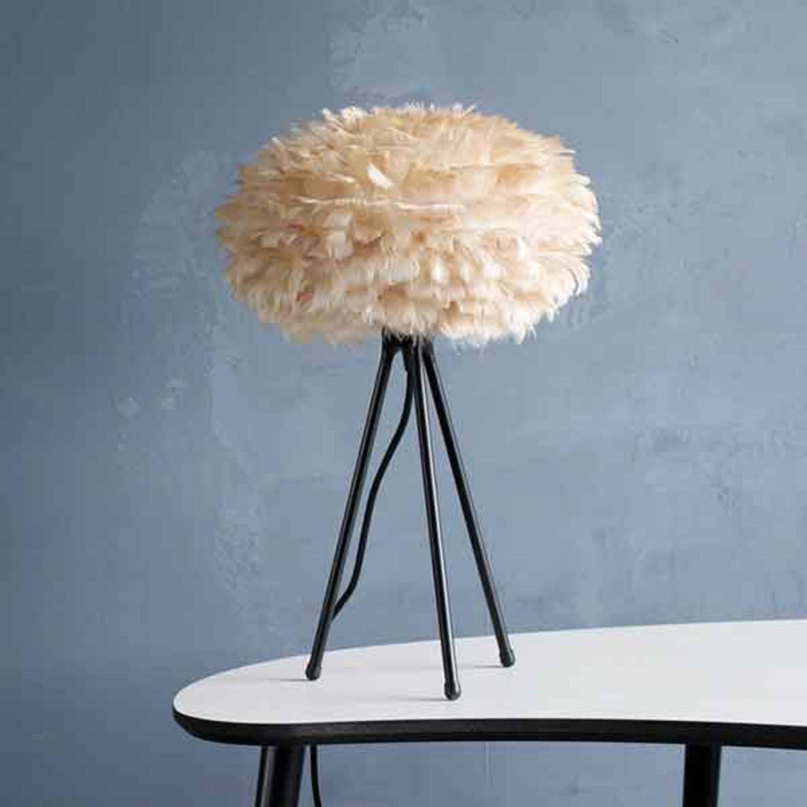 Stolová lampa Eos Mini na trojnožke s pierkovým tienidlom Stolová lampa Eos Mini v sebe spája dva moderné prvky, ktoré by nemali chýbať v žiadnej modernej obývačke. Pocitovú atmosféru umocňuje rovnomenný trojnohý rám a použitie približne 900 pravých husacích pier, ktoré dodávajú lampe veľmi prirodzený vzhľad. Použitie prírodných, severských farieb dodáva stolnej lampe fascinujúcu krásu. Eos Mini vyžaruje teplé, mäkké svetlo, ktoré jemne presvitá cez množstvo pierok a vytvára v miestnosti príjemnú atmosféru. Vďaka možnosti výberu vlastnej žiarovky E27 môžete ovplyvniť svetelný efekt a optimalizovať ho podľa vlastných preferencií. Táto ikonická lampa s pierkami je dizajnérskym kúskom Sørena Ravna Christensena, spoluzakladateľa dánskej spoločnosti UMAGE. Táto spoločnosť sa vždy inšpiruje škandinávskym štýlom a vyrába vysokokvalitné, udržateľné a moderné výrobky. Dôležitá je najmä flexibilita výrobkov – komponenty sa dajú rôzne kombinovať a vytvárať tak stále nové svietidlá.