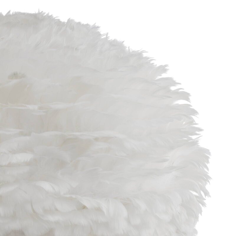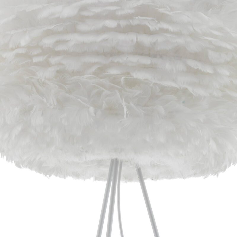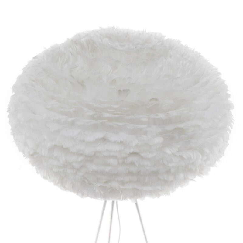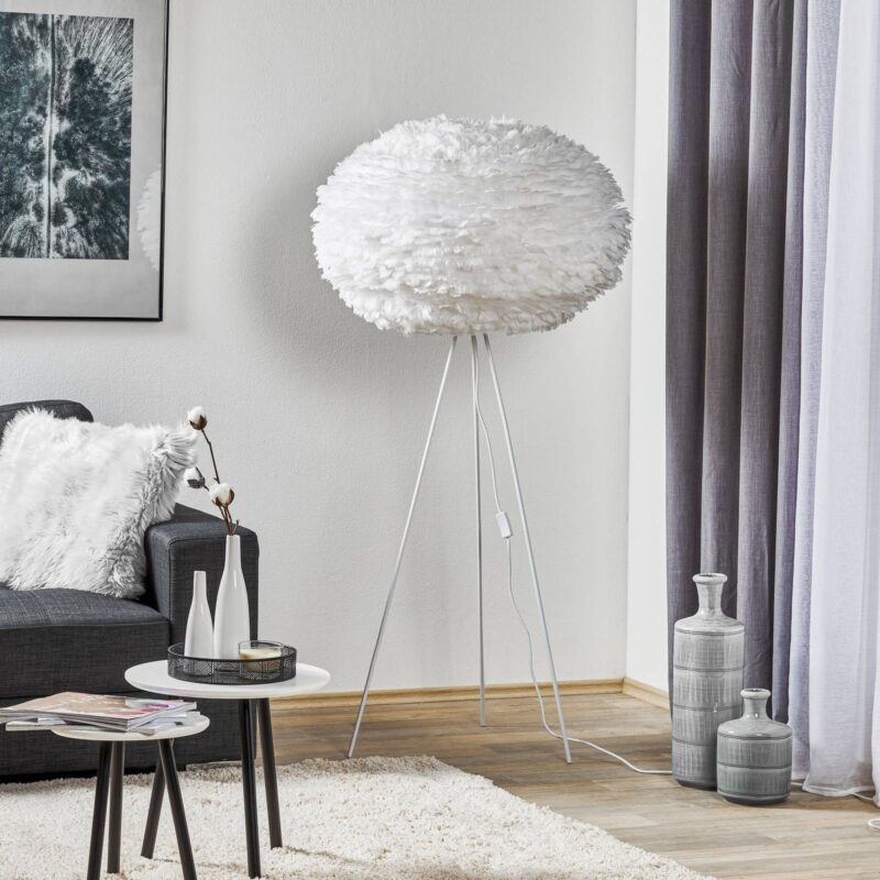 Biela, trojnohá podlahová lampa Eos X-large s veľkým tienidlom Trojnohá podlahová lampa Eos X-large s veľkým tienidlom z peria prezentovaná v bielej farbe. Tienidlo má 6 000 reálnych husacích pierok, ktoré sú mäkké a hebké nie len na dotyk, ale aj svetelný efekt je veľmi mäkký. Tu sa Søren Ravn Christensen, dizajnér lampy Eos X-large, nechal inšpirovať jednoduchou krásou severského dizajnu, ktorá sa vyznačuje svojou veľkou prirodzenosťou. Aj k tomu patriaci trojnohý stojan lampy pochádza od Christensena, tvorivého vývojára a spoluzakladateľa UMAGE, výrobcu svietidiel z Dánska, ktorý sa zaviazal rozvíjať svojimi dielami škandinávsky dizajn a vyjadriť to pri vytváraní vysokokvalitných výrobkov. – Nepoužíva sa perie zo živých zvierat. – Pri znečistení sa dá tienidlo vyčistiť sušičom na vlasy.