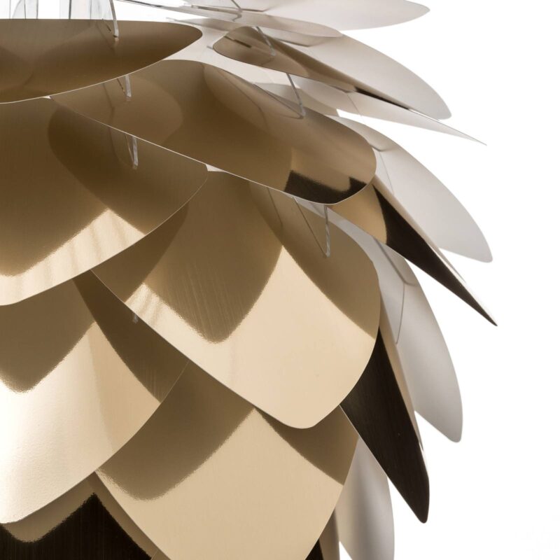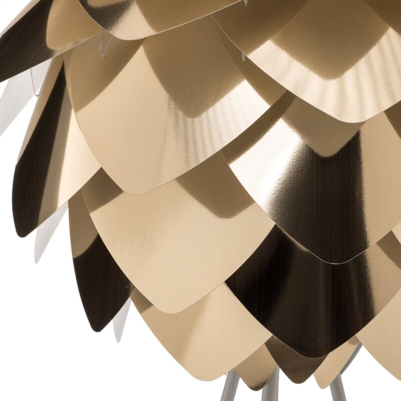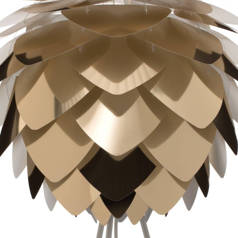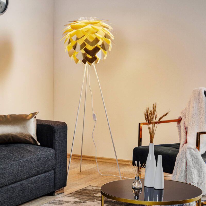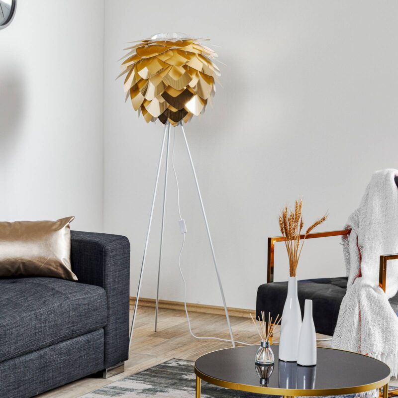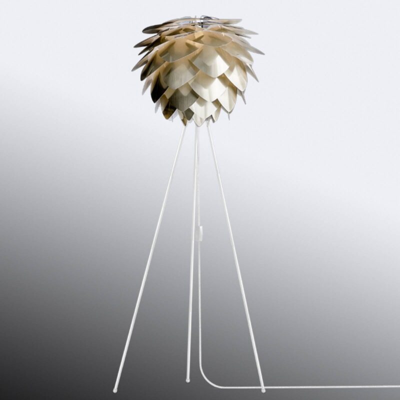 Trojnohá stojacia lampa Silvia medium s mosadzným tienidlom Tienidlo stojacej lampy Silvia medium sa podobá rastline a mosadznou farbou, najmä keď je svetlo zapnuté, je osobitne zdôraznená jeho exotická krása. Tienidlo tímu Vita Design sa spojením s trojnohým bielym rámom, nalakovaným na bielo, ktorý navrhol Søren Ravn Christensen, stáva zdrojom svetla, ktorý nielen slúži ako zdroj svetla, ale je v neosvetlenom stave je pútačom v obytnom priestore. Fantastická dizajnérska stojacia lampa vyrobená dánskou spoločnosťou UMAGE, ktorej cieľom je ďalší vývoj škandinávskeho dizajnu s jeho minimalistickou krásou. – so šnúrovým spínačom a 300 cm textilným káblom