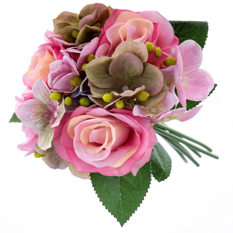 Umelá kytice Ruže s hortenziou, tmavoružová