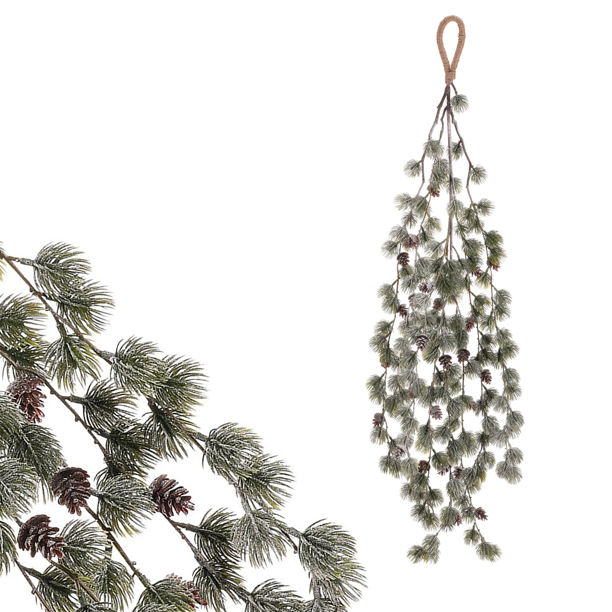 Závesná dekorácia Smrekovca so šiškami vnesie do interiéru autentický zimný nádych a útulnú atmosféru. Husté vetvičky v prirodzene zelenom odtieni sú doplnené drobnými šiškami, ktoré pôsobia realisticky a navodzujú dojem čerstvo nazbieraných vetiev z lesa. Vďaka závesnému povrázku je možné dekoráciu ľahko umiestniť na dvere, stenu, okenný rám alebo do priestoru, kde vynikne jej prirodzený vzhľad.Kombinácia drobných ihličiek, decentného ojínenia a prírodného povrázku vytvára harmonický celok, ktorý krásne ladí s vianočnými i rustikálnymi doplnkami. Dekorácia je vyrobená z kvalitného plastu, ktorý je odolný, tvarovo stály a nevyžaduje žiadnu údržbu. Možno ju využiť opakovane každý rok bez toho, aby stratila na svojej atraktivite.Hlavné výhody produktu
