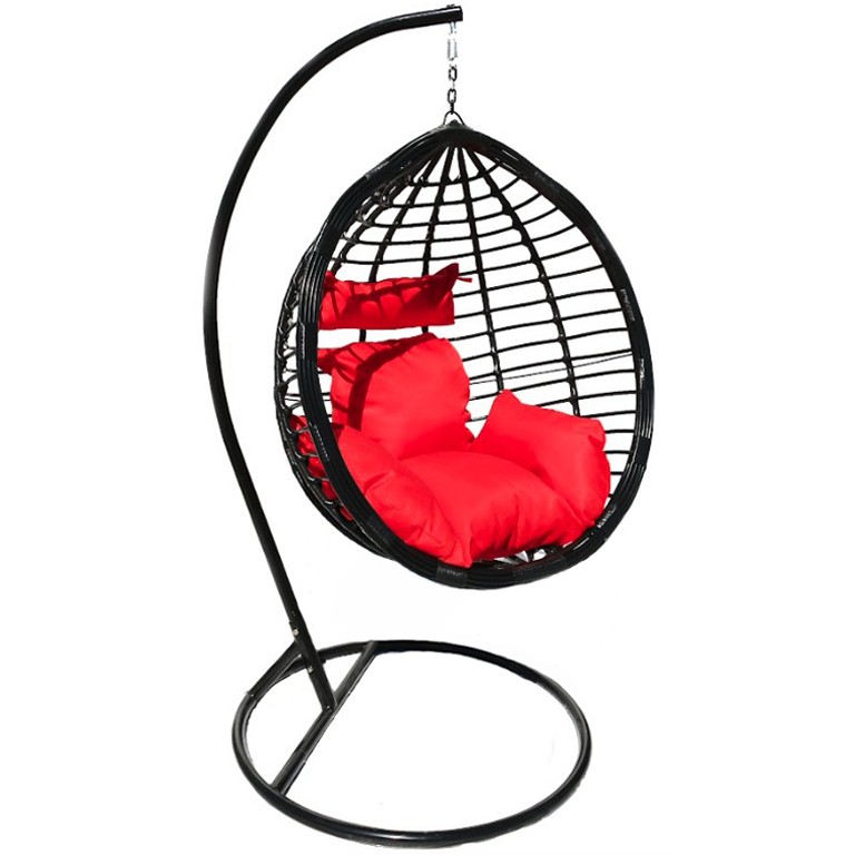 Unikátne čierne závesné kreslo s rôznymi vankúšmi Červené vankúše 120×108 cm