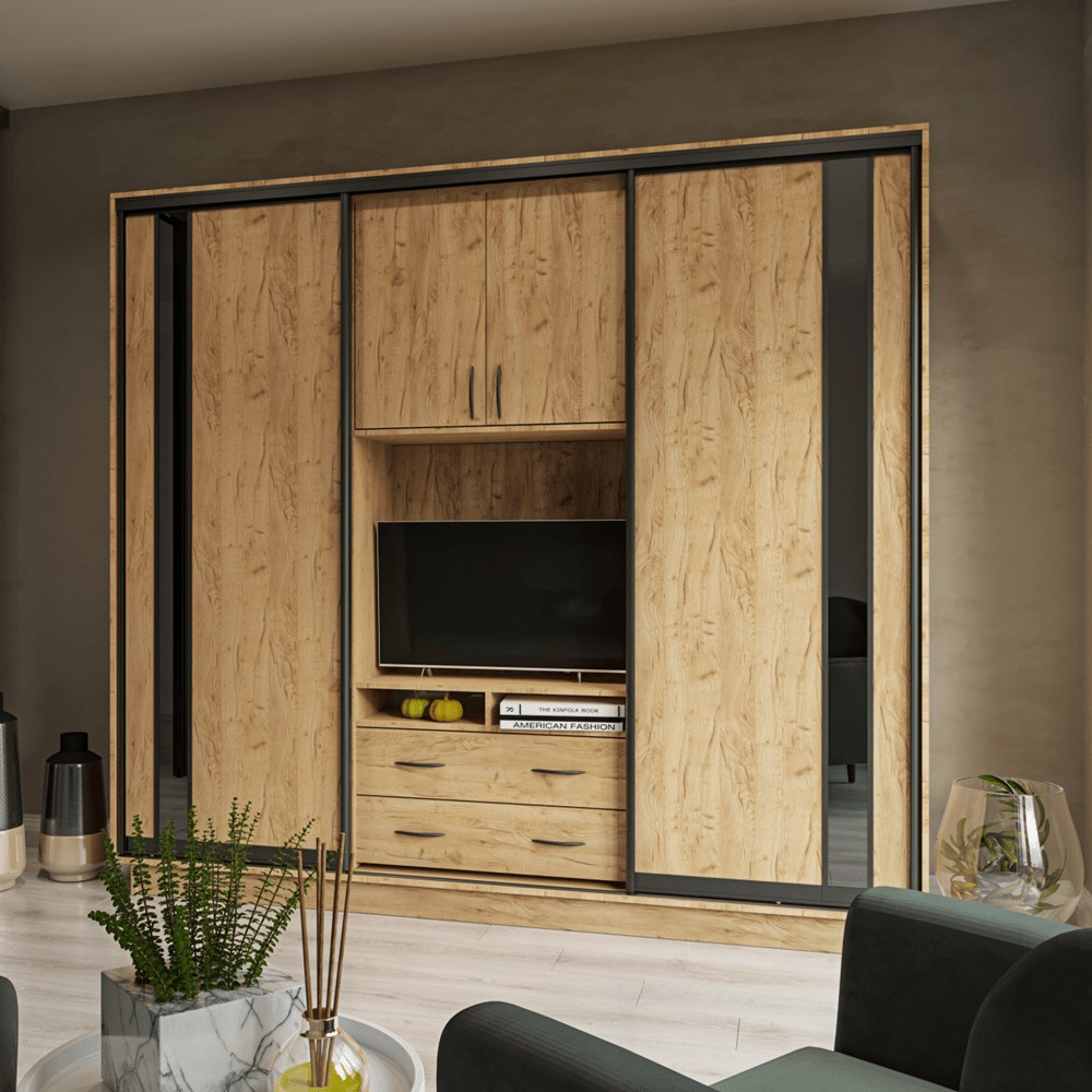 UNIVERZAL 240 je výnimočná šatníková skriňa, ktorá ponúka nielen úložný priestor na bielizeň, ale aj priestor pre umiestnenie TV prijímača. Je vhodná tak do spálne, ako aj do obývacej miestnosti. Táto skriňa osloví každého, kto chce účelne využiť priestor. Skriňu Vám ponúkame v žiadanom farebnom prevedení ktorá skvele doplní každý interiér.Predná časť je v kombinácii dub Craft zlatý s čiernym dekoračným pásom.Výnimočnosť skrine je v jej netypickej výške až 220 cm, čím sa zabezpečí väčší úložný priestor. Dve zásuvky sú skvelým doplnkom, ktorý zaiste oceníte.Rozmery úložných častí si môžete pozrieť na fotke.Skriňa je členená na policovú a závesnú časť s 1 závesnou tyčou. Korpus skrine je vyrobený z kvalitnej LTD dosky.Rozmery v/š/h: 220 x 240 x 60 cm.Dodávame v demonte.