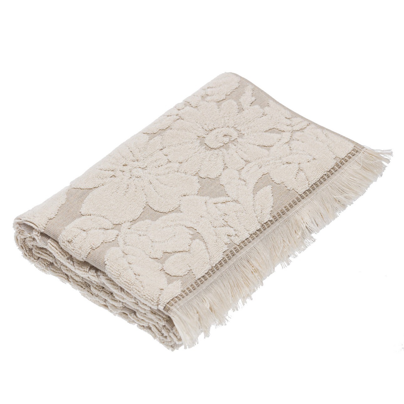 Béžový kvetinový uterák s ozdobnými strapcami.