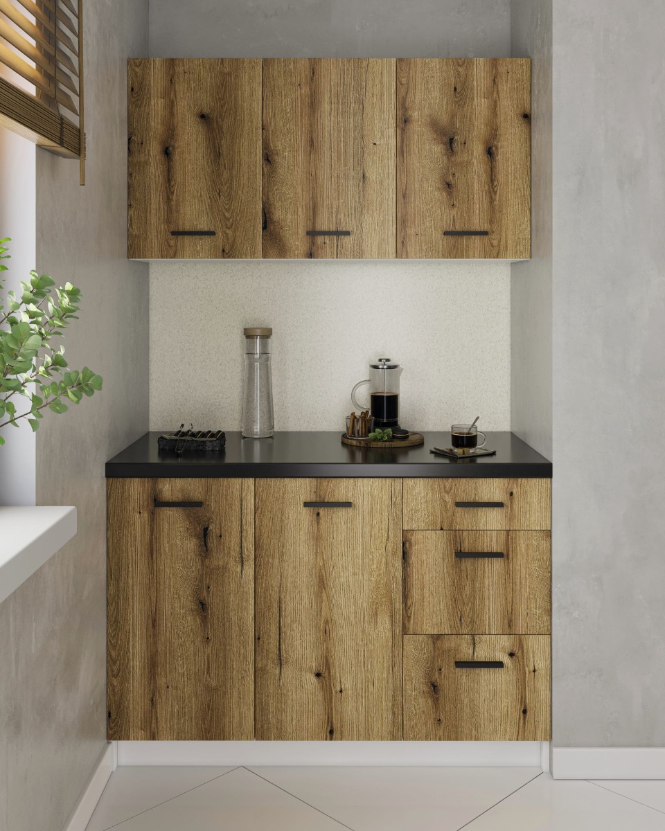 Malá kuchynská linka VANESA v prírodnom farebnom prevedení a jednoduchom dizajne. Táto elegantná kuchyňa je cenovo výhodná a vďaka svojmu nadčasovému dizajnu bude moderná aj o niekoľko rokov.Skrinky kuchynskej linky sú vyrobené z kvalitnej 16 mm LTD dosky. Čierne 128 mm úchyty dopĺňajú moderný charakter.Farebné prevedenie:Korpus: biela matnáDvierka: dub EvokeKuchynská linka VANESA 120 obsahuje:Horné skrinky:VIOLA trojdverová skrinka š120/v60/h29Dolné skrinky:VIOLA dvojdverová + 3 zásuvky š120/v82/h46Pracovná doska NIE JE súčasťou zostavy, je potrebné ju dokúpiť (viď. Odporúčané produkty)Dodávame v demonte s návodom na montáž.