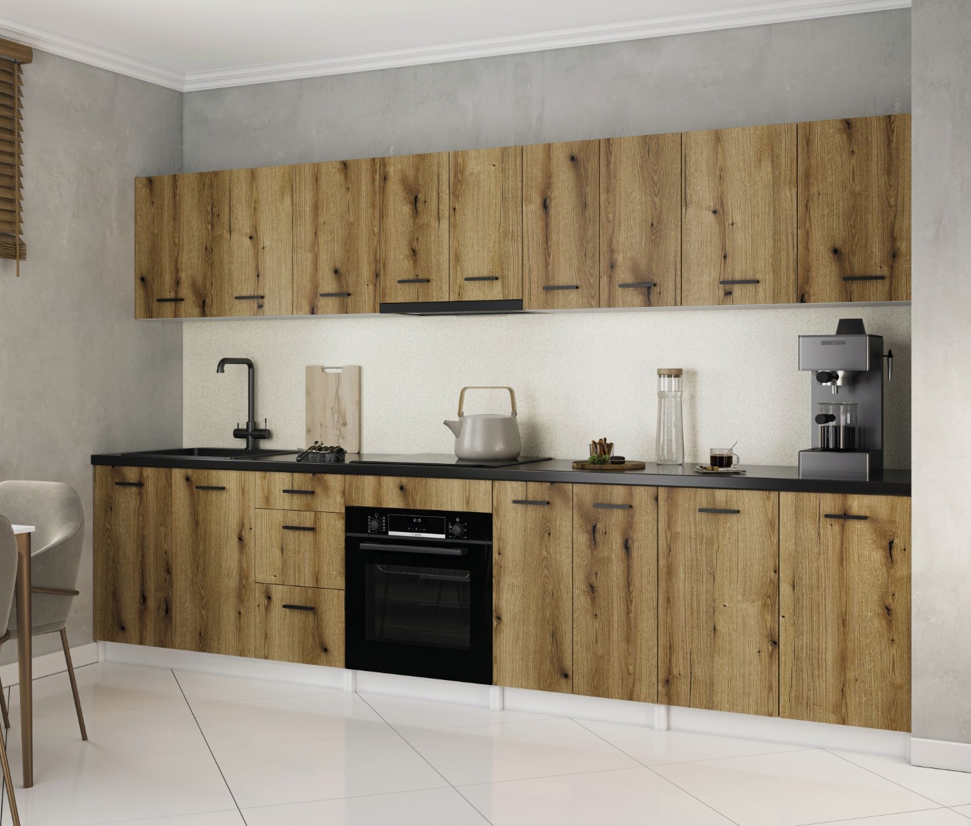 Veľká kuchynská linka VANESA v prírodnom farebnom prevedení a jednoduchom dizajne. Táto elegantná kuchyňa je cenovo výhodná a vďaka svojmu nadčasovému dizajnu bude moderná aj o niekoľko rokov.Skrinky kuchynskej linky sú vyrobené z kvalitnej 16 mm LTD dosky. Čierne 128 mm úchyty dopĺňajú moderný charakter.Farebné prevedenie:Korpus: biela matnáDvierka: dub EvokeKuchynská linka VANESA 320 obsahuje:Horné skrinky:VIOLA trojdverová skrinka š120/v60/h29VIOLA dvojdverová skrinka š60/v60/h29VIOLA digestorová skrinka š60/v56/h29VIOLA dvojdverová skrinka š80/v60/h29Dolné skrinky:VIOLA dvojdverová + 3 zásuvky š120/v82/h46VIOLA dvojdverová skrinka š60/v82/h46VIOLA skrinka na vstavanú rúru š60/v82/h46VIOLA dvojdverová skrinka š80/v82/h46Drez a pracovná doska NIE JE súčasťou zostavy, je potrebné ich dokúpiť (viď. Odporúčané produkty)Dodávame v demonte s návodom na montáž.