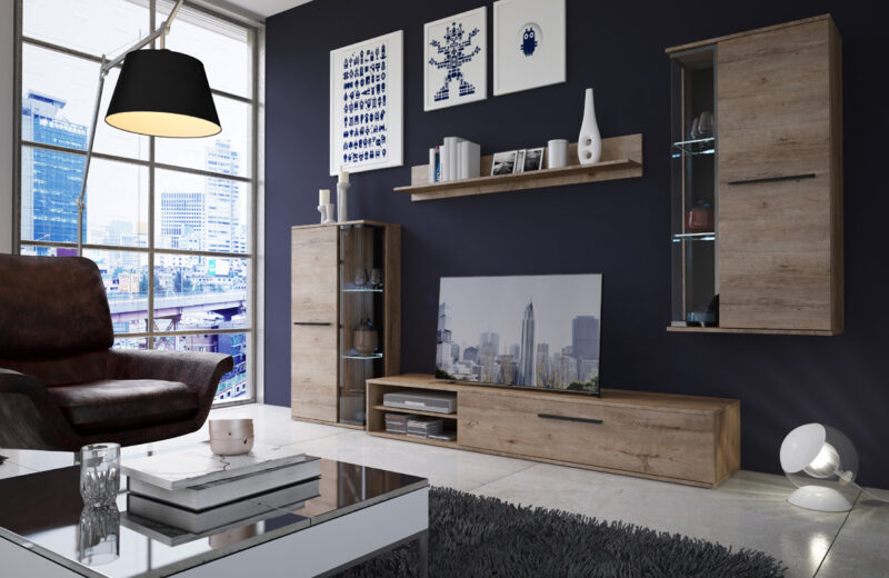 Moderná obývacia stena LACOSTA v atraktívnom dizajne.Materiál kvalitné lamino v zaujímavom farebnom prevedení dub šedý.V zostave do obývacej steny sa nachádza (š/h/v):- TV podstavec ( 180 x 42 x 31 cm ), – vitrína ( 61 x 32 x 116 cm ),- komoda ( 61 x 32 x 116 cm ),- polica ( 138 x 18 x 20 cm ).Jednotlivé prvky nie je možné zakúpiť samostatne – stena sa predáva iba ako komplet.Vo vitrínových skrinkách sa nachádzajú sklenené police, ku ktorým je možné dokúpiť efektné LED osvetlenie.Dodávame v demonte