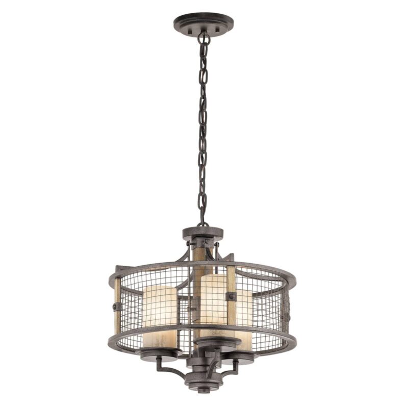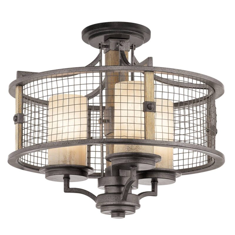 Od stropného svietidla po visiace lustre – Ahrendale Stropné svetlo Ahrendale je možné podľa potreby použiť aj ako visiace lustre : Retiazka dlhá 182,9 cm, ktorá je súčasťou dodávky, sa potom jednoducho namontuje medzi striešku a svetlo. Rustikálny vzhľad so železom a drevom dodáva stropnému svetlu Ahrendale osobitý vkus, ktorý je možné zladiť s najrôznejšími možnosťami vybavenia. tienidlo na lampu od Ahrendale pozostáva zo železnej mriežky, ktorá je chránená okolo troch jantárovo zafarbených štruktúrovaných skiel svietidla. Sklenená štruktúra tiež vytvára mimoriadne príjemné svetlo.