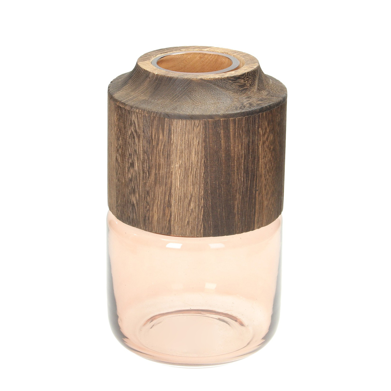 Váza zo skla a dreva v prírodnej farbe.