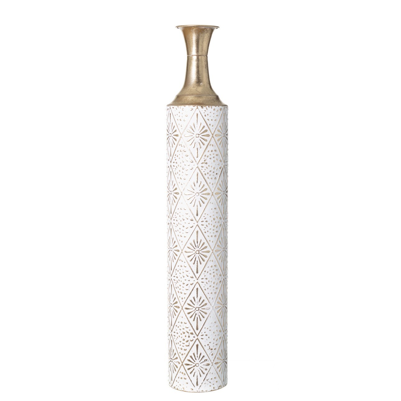 Kovová váza s orientálnym vzorom v starozlatej a bielej farbe. Výrazná váza so zaujímavou farebnou kombináciou starozlatej a bielej farby. Jemné trenie a decentný orientálny motív vám umožnia preniesť sa do teplých, exotických krajín. Ideálna na vytváranie vlastných jedinečných kvetinových kompozícií. Výborne sa hodí k ostatným doplnkom v aranžmánoch vo vintage, modernom koloniálnom alebo orientálnom štýle. Originálnu, pútavú elegantnú dekoráciu vytvoríte s menšou verziou vázy z rovnakej série. Pozrite si aj našu zaujímavú ponuku ďalších jedinečných váz, z ktorej si určite vyberiete niečo podľa svojich predstáv!