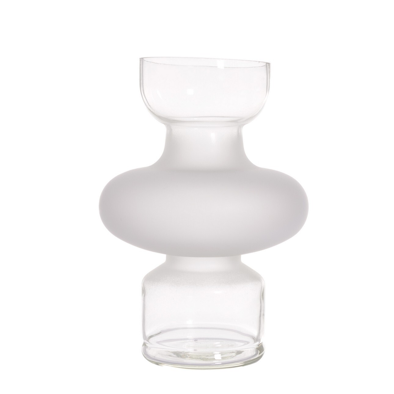 Váza z mliečneho a priehľadného skla. Ideálny ako dekoratívny prvok. Krásne vyzerá v obývacej izbe, spálni alebo jedálni. Jedinečná dekorácia, ktorá pôsobivo zvýrazní kvetinové kompozície. Tento praktický doplnok určite nezostane bez povšimnutia členov domácnosti alebo hostí.Sklenená dekorácia sa hodí k váze s podobným dizajnom. Rozmery: stred 20 cm, výška 28 cm.