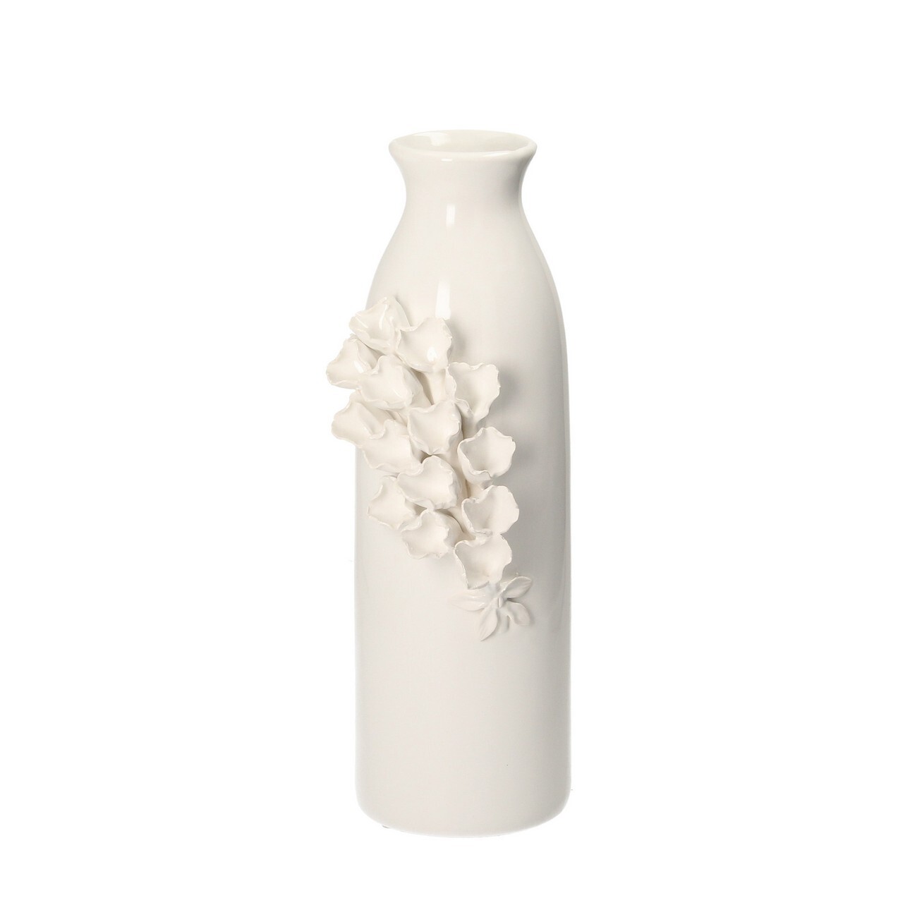 Keramická dekoratívna váza s krásnym kvetinovým dekorom. Klasický tvar je obohatený jemným kvetinovým vzorom v tvare jemných zvončekov. Elegantná krémovo biela farba dodá štýl a zvýrazní každú kvetinovú kompozíciu. Hladký, mierne lesklý povrch vyzerá krásne na stole, konferenčnom stolíku alebo parapete. Je vyrobený z keramiky a bude decentnou dekoráciou do obývačky, pracovne alebo spálne.Kombinujte ju s menšou vázou podobného charakteru a tešte sa z krásnych, kvetinových aranžmánov vo vašom interiéri!