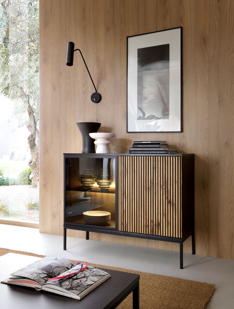 VEDO komoda s lamelami K104, čierna/dub wotan