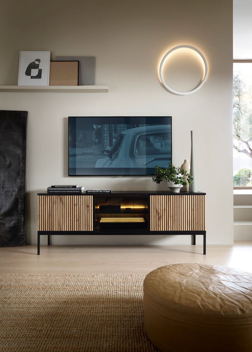 Sekciu VEDO tvoria nočné stolíky, komody a vysoká vitrína.Jednou z hlavných charakteristických vlastností je čierná farba doplnená lamelami vo farbe dub wotan. Za presklenou časťou tohto nábytku je jemné podsvietenie. Sekcia VEDO je vyrobená z kvalitnej laminovanej dosky s odolnými ABS hranami a má vysoké kovové nožičky. Televízny stolík v rozmeroch 154 x 56 x 39 cm poskytuje dostatok úložného priestoru pre vašu domácnosť. Stolík je rozdelený tromi dvierkami na tri samostatné časti.Systém otvárania push to open. Dodávame v demonte.