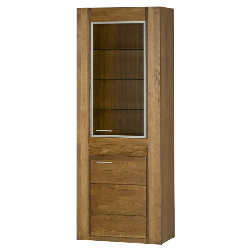 Vitrína V-11 patrí do modernej sektorovej rady VELET. Nábytok je vyrobený z vysoko kvalitných materiálov: korpus je z prírodnej dyhy, predné časti sú z masívneho dreva. Elegantné farebné prevedenie dub rustikálny. Otváranie dvierok do pravej strany. Sklo na vitríne je číre. Osvetlenie vo vnútri vitríny nie je v cene, je možné ho dokúpiť. Horizontálne osvetlenie zabudované do drevenej časti nábytku je v štandarde. Rozmer š/v/h 75 x 200 x 42 cm. Dodávame v zmontované.V sektore VELET sa nachádza 15 rôznych elementov, z ktorých je možné zariadiť si originálnu jedáleň či obývačku.