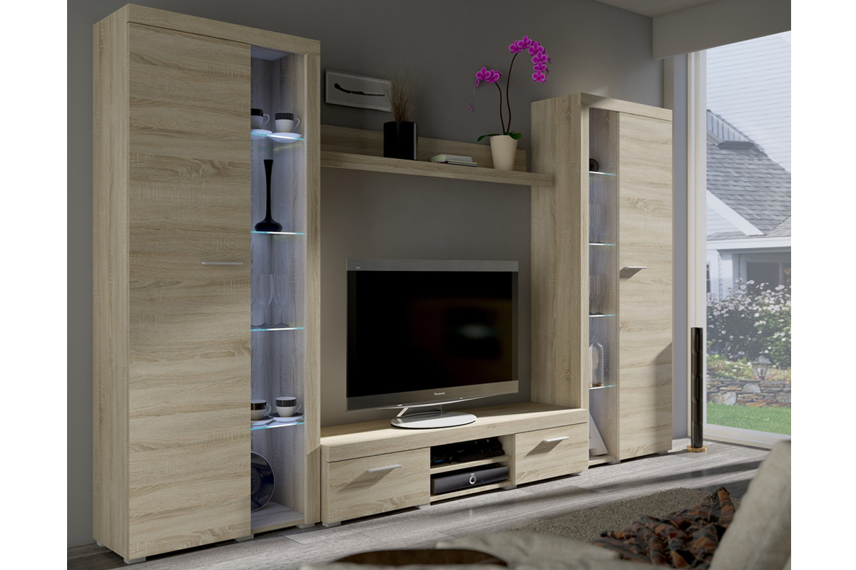 Obývacia stena BRUMA XL zaujme aj náročnejších užívateľov.Je v dizajnovom a modernom prevedení. Je vyrobená z kvalitných LTD dosiek, ktoré sa ľahko udržiavajú. Je vo farebnom prevedení dub sonoma.Rozmery obývacej steny (š,v,h): 300 x 190 x 40.3 cm.V obývacej zostave sa nachádzajú nasledujúce prvky:- 2 x vysoká vitrína – rozmery (š,v,h): 75 x 190 x 33,8 cm- RTV skrinka – rozmery (š,v,h): 150 x 31,50 x 40,2 cm- polica – rozmery (š,v,h): 140 x 16 x 17,6 cm.Obývaciu stenu BRUMA je možné zakúpiť len ako celok.LED osvetlenie nie je v cene. Je možné si ho dokúpiť.Dodávame v demonte.
