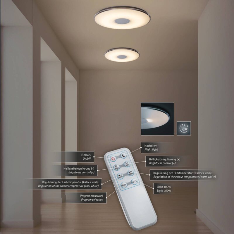 Multifunkčné, kruhové stropné LED svietidlo Tokyo s mnohými funkciami S priemerom 60 cm je stropné LED svietidlo Tokyo vhodné aj do veľkých miestností. Ponúka absolútnu flexibilitu, pretože s diaľkovým ovládačom, ktorý je súčasťou dodávky, sa dá nielen plynule regulovať farba svetla v rozsahu od teplej bielej (3000 K) po denné svetlo (5500 K), ale aj tlmiť intenzita svetla. Mnohé miestnosti, od obývačky, cez predsieň až po spálňu, sa dajú s týmto stropným svietidlom osvetliť efektne a vždy zodpovedajúc príslušnej situácii. To však ešte nie je všetko – vďaka funkcii nočného osvetlenia je toto svietidlo v noci perfektným orientačným svetlom.