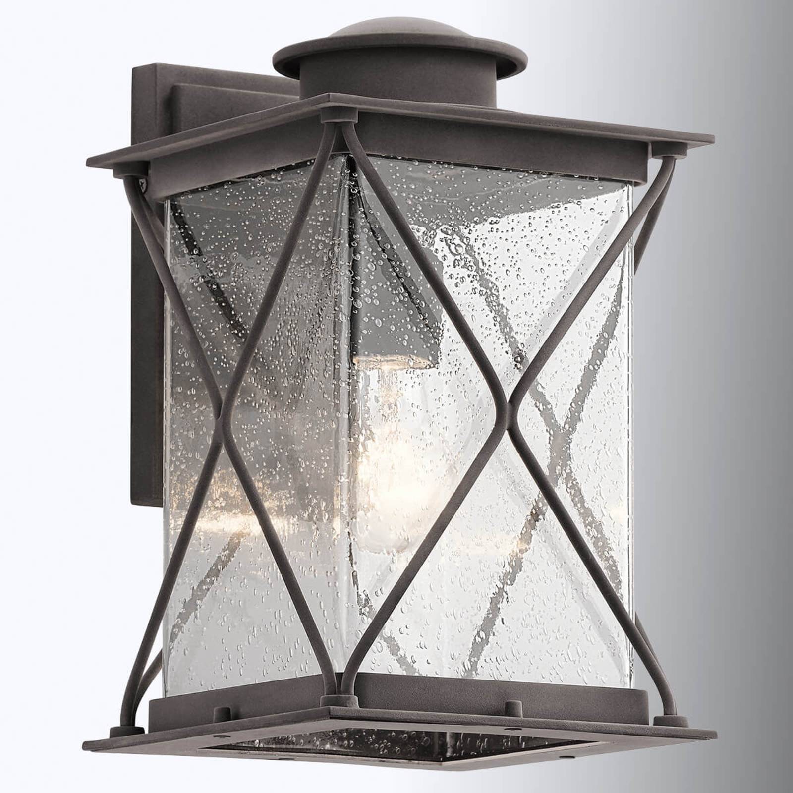 Veľké vonkajšie nástenné svietidlo Argyle v tvare lucerny Vonkajšie nástenné svietidlo Argyle je vďaka svojmu tvaru a farebnému prevedeniu takmer predurčené na použitie v spojení s rustikálnym štýlom rustikálneho štýlu. Krásna lucerna šíri veľmi príjemné svetlo prostredníctvom svojho jasného, mierne vzorovaného skleneného tienidla, ktoré v tejto oblasti vytvára útulné prostredie. Kovový rám vyzerá vďaka povrchovej úprave – povrchová úprava so vzhľadom zvetraného zinku – veľmi autenticky, a preto sa hodí aj k starším stenám. Rustikálne pôsobia aj skrížené kovové tyče, ktoré slúžia ako ochrana skla.