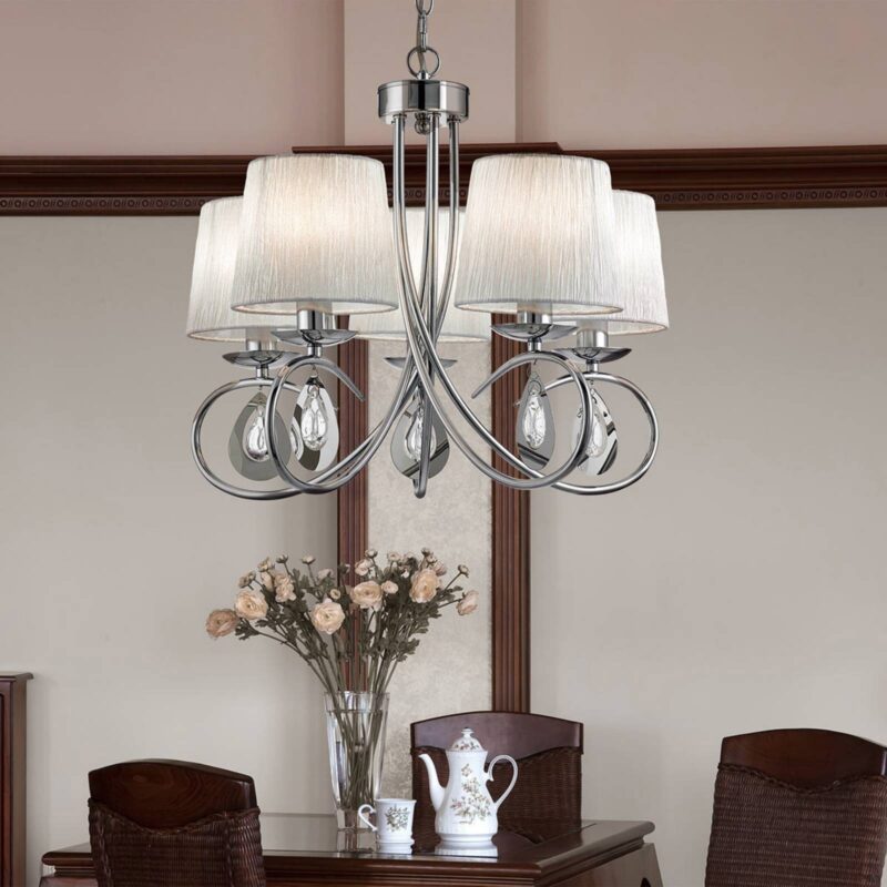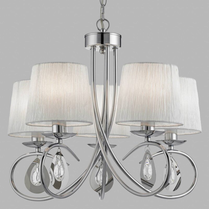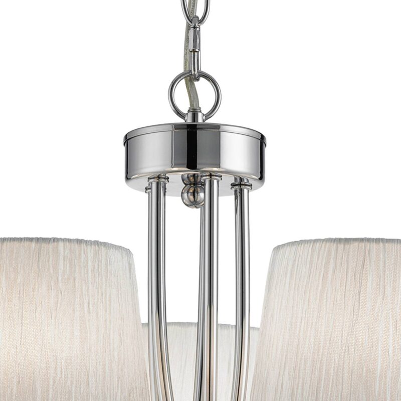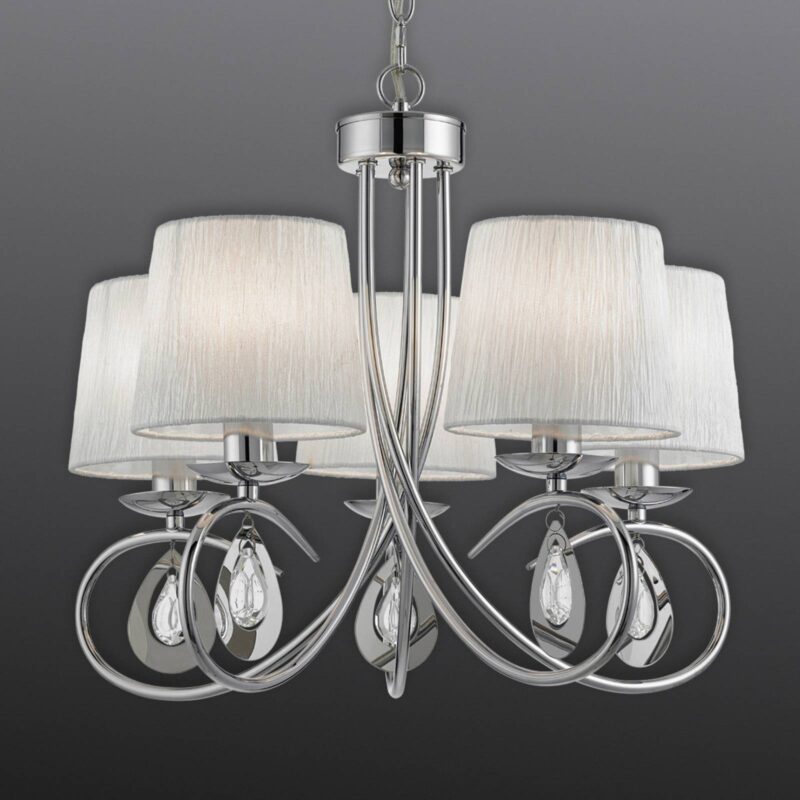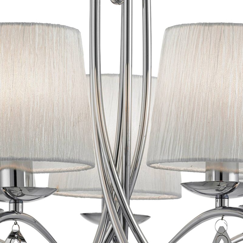 Veľmi pekná závesná lampa Angelique 5-pl. Pri nádhernej závesnej lampe Angelique existuje niekoľko faktorov, vďaka ktorým je jedinečne krásna. Na jednej strane je 5 vertikálne prepojených chrómových rámov lampy so slučkovým koncom a korunkovými tienidlami z látky, zatiaľ čo na druhej strane chrómovo-sklenené kvapky umiestnené v slučkách ramien, ktoré dodávajú závesnej lampe veľmi cenný charakter. V tienidlách sú osadené E14 žiarovky, ktoré poskytujú príjemné svetlo. Svetlo je pripevnené k stropu pomocou držiaka reťaze, ktorý len dotvára vizuálny optický obraz.