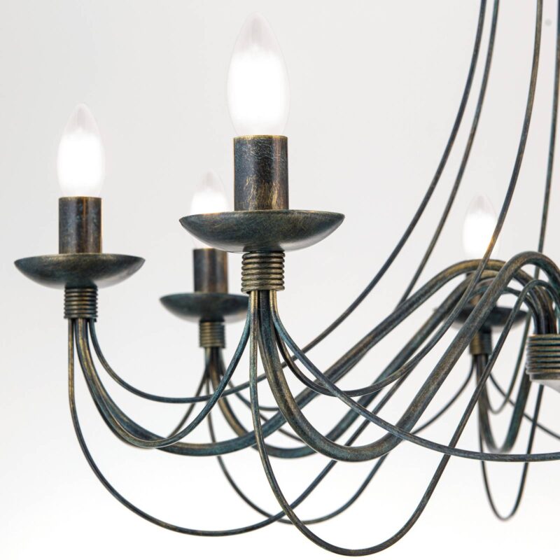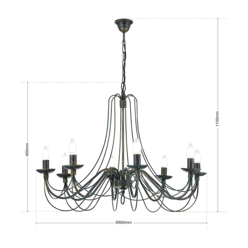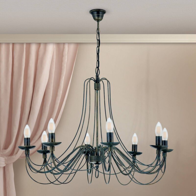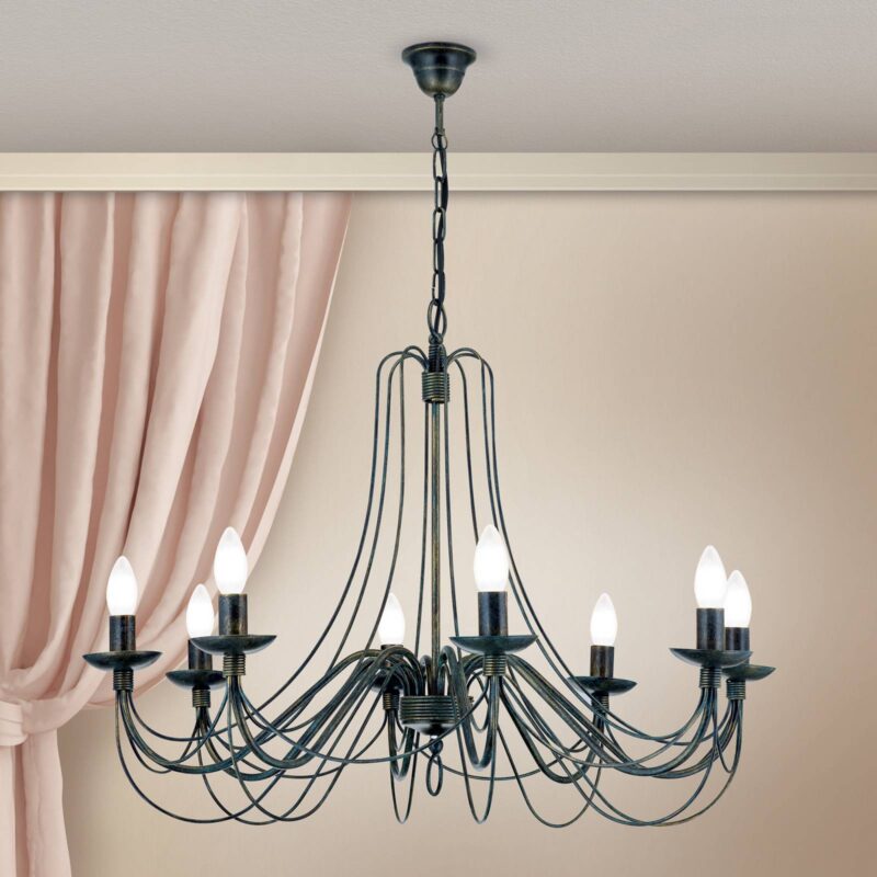 Veľký luster CLARA s 8 žiarovkami vo vidieckom štýle Je to možné vďaka kováčskemu umeniu – osem sviečok akoby tancuje na plávajúcich lanách a tak šíri pôsobivý jas. Toto svietidlo je pre svoj priemer 80 cm a 8 žiaroviek vhodné aj do veľkých miestností.