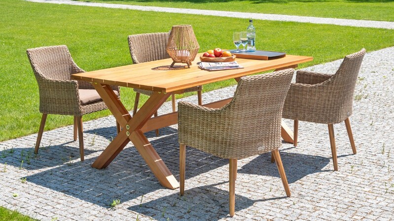 Elegantná stolová zostava Velt Faro v kombinácii agátového dreva a výpletu z umelého ratanu.