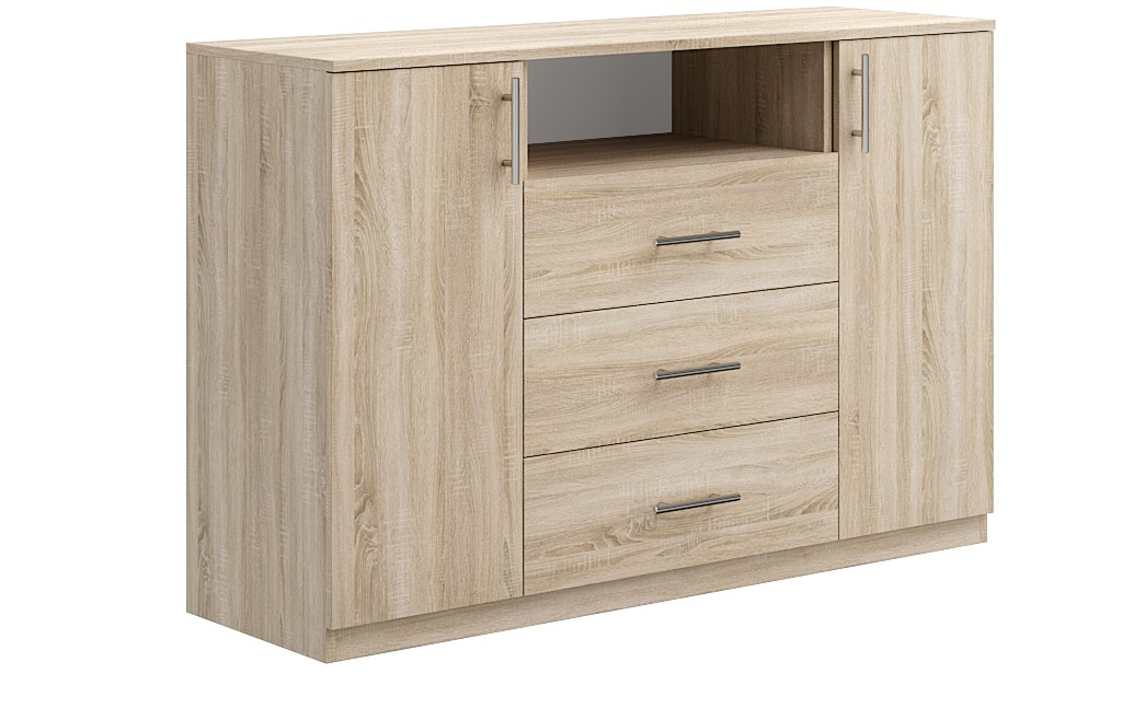 Moderná komoda VENA vo viacerých farebných prevedeniach poteší praktickým riešením, vďaka ktorému získate dostatok priestoru pre uloženie vašich vecí. Je dvojdverová, má tri zásuvky, nad ktorými je odkladacia polica. Je vyrobená z kvalitnej 16 mm hrubej LTD dosky. Úchyty sú plastové.Farebné prevedenie dub sonoma.Rozmery (ŠxVxH): 120 x 84,5 x 46 cm.V ponuke ďalšie prvky spálňového sektoru VENA, vďaka ktorému si zariadite spálňu štýlovo, no za priaznivú cenu. Dodávame v demonte.