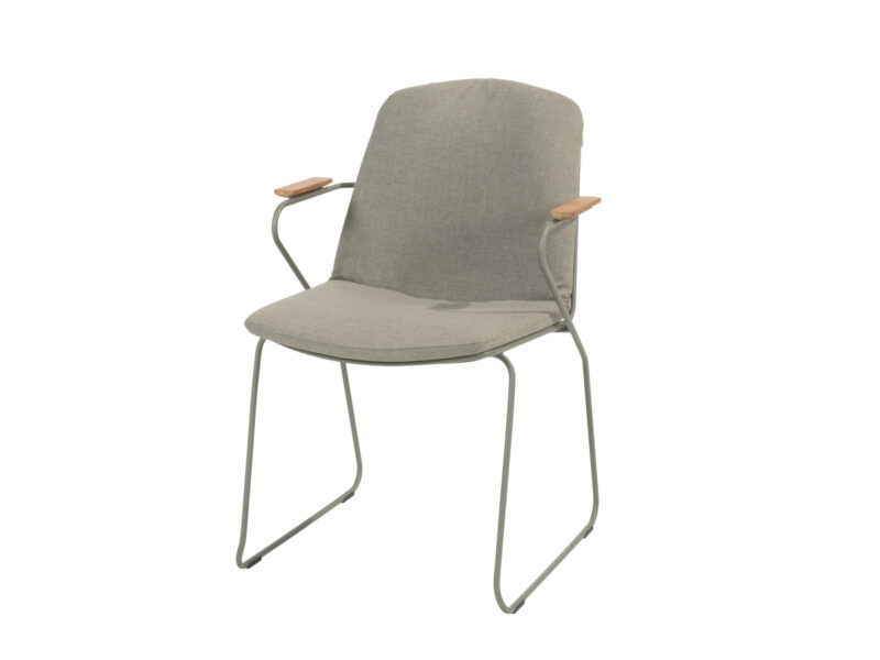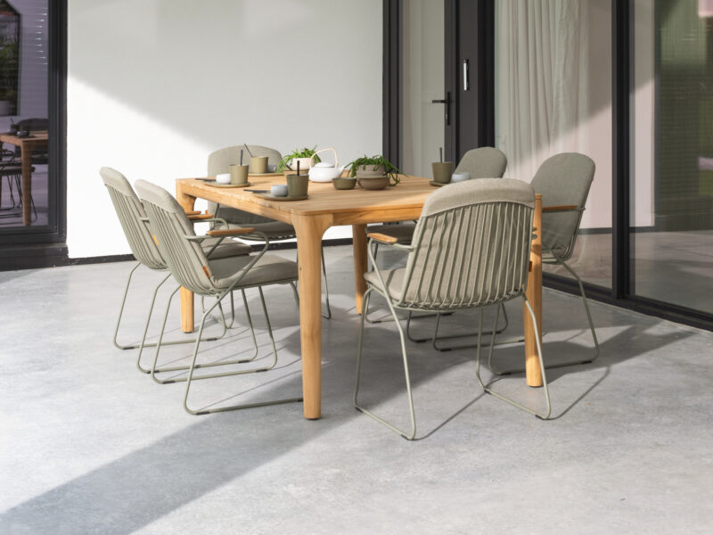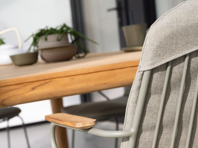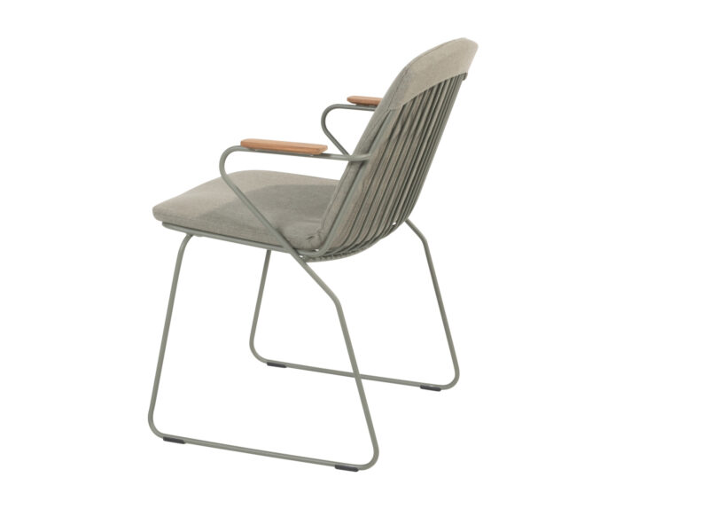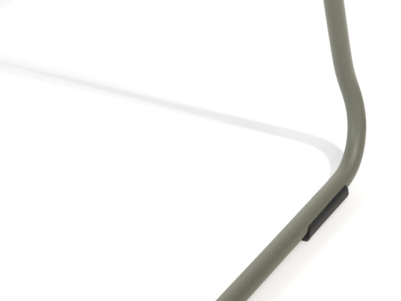 Nadčasová stohovateľná jedálenská stolička Veneto v olivovej farbe v kombináci prírodných materiálov a nehrdzavejúcej ocele.