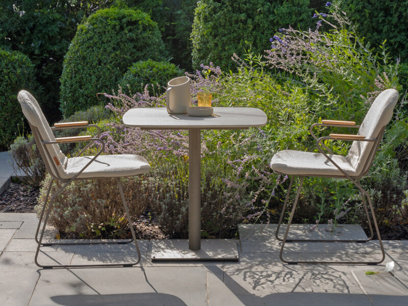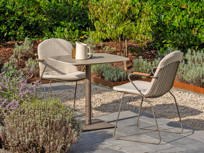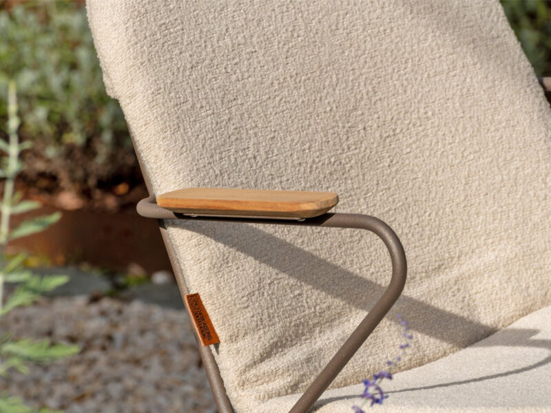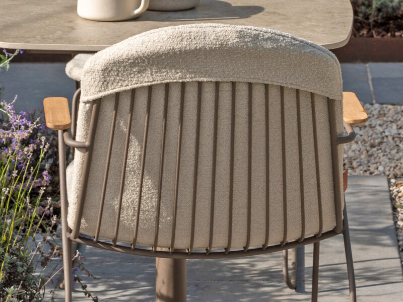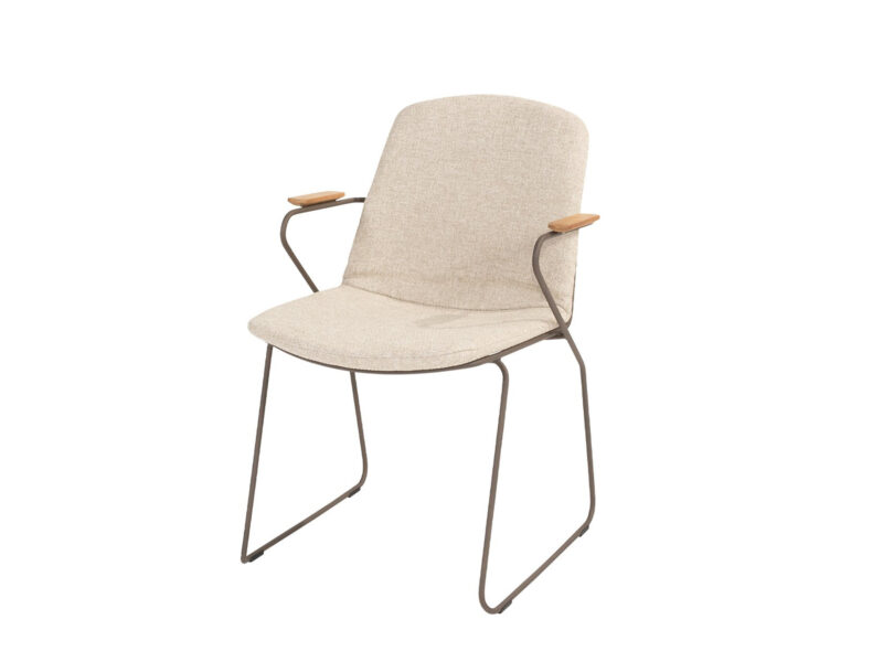 Veneto stohovateľná jedálenská stolička má ergonomický dizajn, teakovú opierku na ruky a pohodlný vankúš, ktorý sa jednoducho nasadzuje cez operadlo.