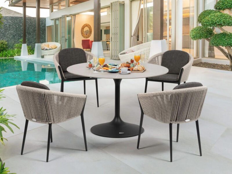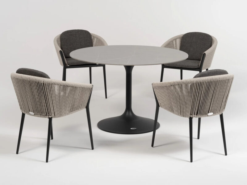 Okrúhly stôl Verona spája moderný dizajn s funkčnosťou. Hliníková konštrukcia zabezpečuje stabilitu a odolnosť, zatiaľ čo kvalitná sinterstone doska mu dodáva eleganciu a vysokú odolnosť voči poškodeniu.
