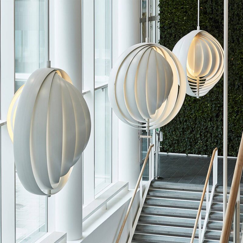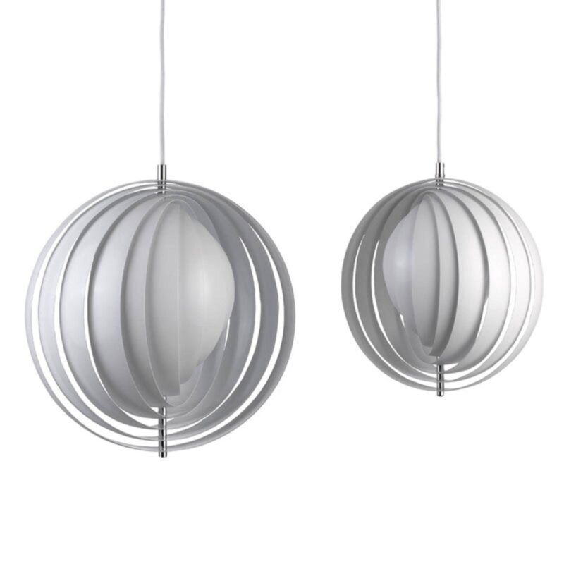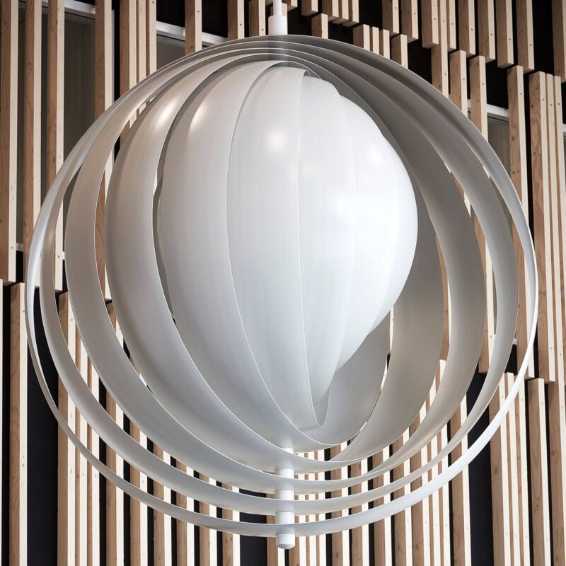 Sférické dizajnové závesné svietidlo Moon z hliníkových lamiel – Verner PantonJedným z prvých svietidiel, ktoré Verner Panton navrhol, bolo závesné svietidlo Moon, ktorým táto ikona dizajnu uviedla do života úplne nový dizajnový štýl. Už pri svojich nábytkových kreáciách si Panton stanovil cieľ navrhovať viac než len nábytok. To, čo vyšlo z pera Vernera Pantona, vždy presahovalo doteraz známe. Jeho výtvory nemali len dopĺňať interiérový dizajn, ale mali fungovať ako štýlotvorné, priestor zaberajúce a ústredné sochy. Medzinárodné nadšenie, ktorému sa závesné svietidlo Moon teší dodnes, dokazuje, že Panton svojím prvým návrhom svietidla niečo dokázal. Desať bielo lakovaných hliníkových lamiel vrstvených do seba tvorí telo tohto dômyselne navrhnutého závesného svietidla. Lamely, ktorých priemer sa zvnútra smerom von zväčšuje, sú pohyblivé a dajú sa otáčať jednotlivo nad sebou. Fascinácia tohto závesného svietidla, rovnako ako mnohých iných návrhov Vernera Pantona, spočíva v detailoch. Po vytvarovaní lamely úplne zakrývajú centrálne umiestnený zdroj svetla, ale dopadajúce svetlo odrážajú cez medzery smerom von, čím vytvárajú nevídanú, dokonale neoslňujúcu hru svetla, ktorá úplne zmení atmosféru v miestnosti. keďže poloha jednotlivých lamiel je variabilná, závesné svietidlo Moon umožňuje rôzne svetelné riešenia. Podobne ako mesiac, ktorý na nočnej oblohe neustále mení svoj tvar, aj svietidlo Vernera Pantona sa prezentuje ako mnohotvárny dizajnový objekt. Nová edícia závesného svietidla Moon má podpis Vernera Pantona na najvnútornejšej z desiatich lamiel.