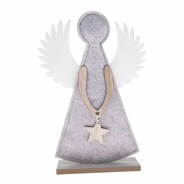 Táto nápadná, ale jemná vianočná dekorácia v podobe anjela držiaceho hviezdu dokonale doplní vaše vianočné dekorácie svojimi jemnými prírodnými odtieňmi v kombinácii šedej a bielej farby. Vďaka drevenej podstavke ju môžete ľahko umiestniť na parapet, poličku alebo komodu, kde spolu s ďalšími dekoráciami vytvorí útulnú sviatočnú atmosféru.